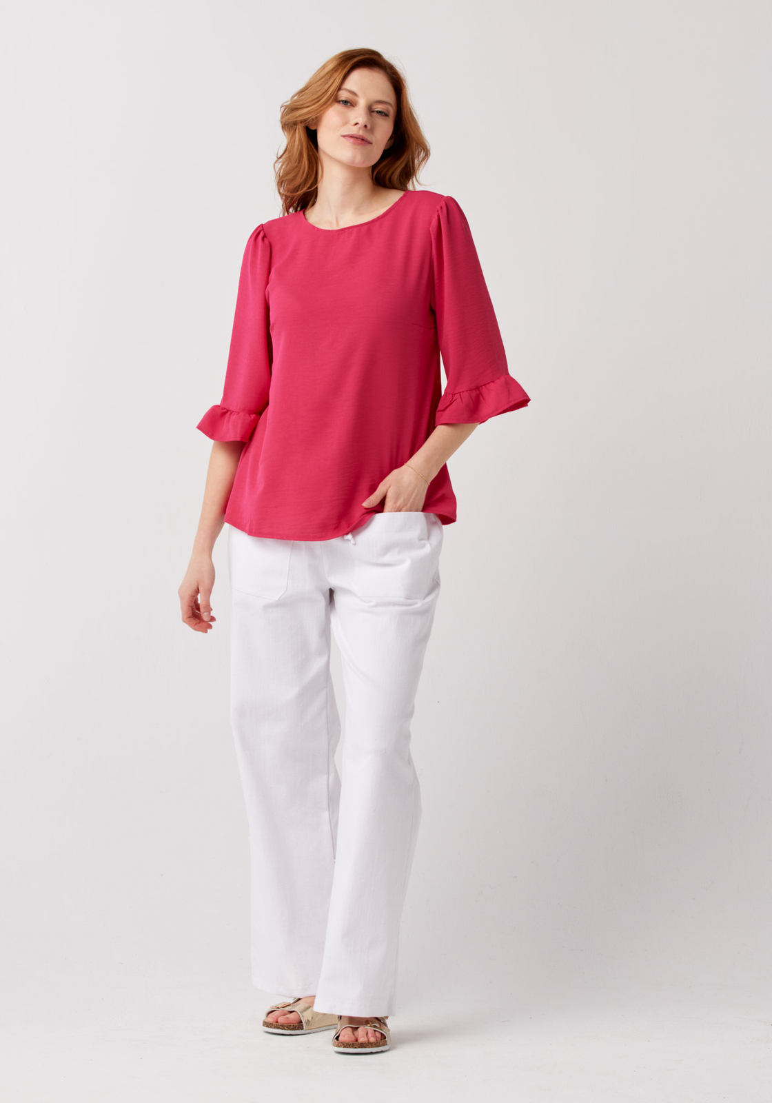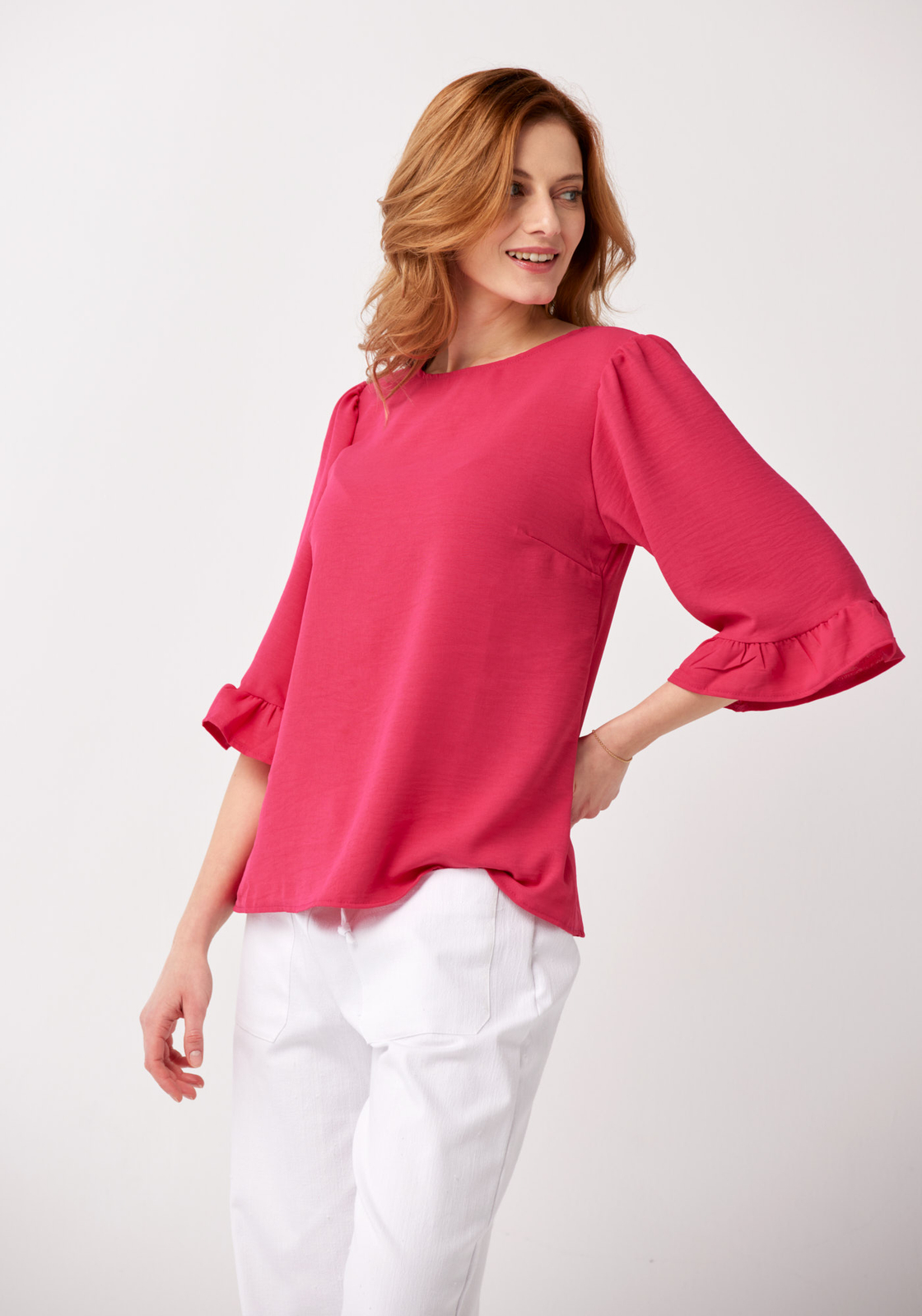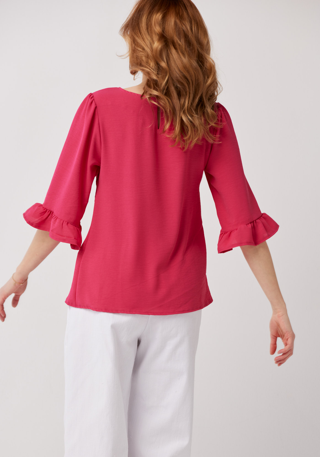 - Lekka, swobodna bluzka z 3/4 rękawami wykończonymi falbaną. Amarantowy piękny kolor bluzki idealnie współgra zarówno z wzorzystą, jak i jednolitą dolną częścią garderoby.