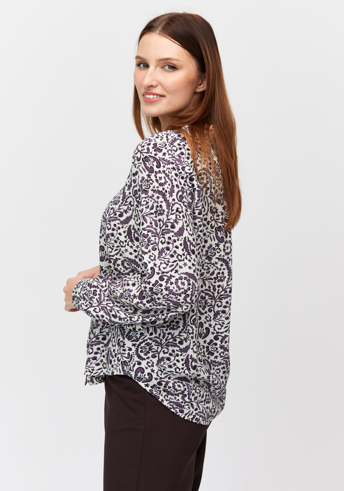 - Koszula ze stójką, zapinana na guziki, z długimi rękawami. Koszula ma florystyczny w kolorze fioletowym na białym tle.