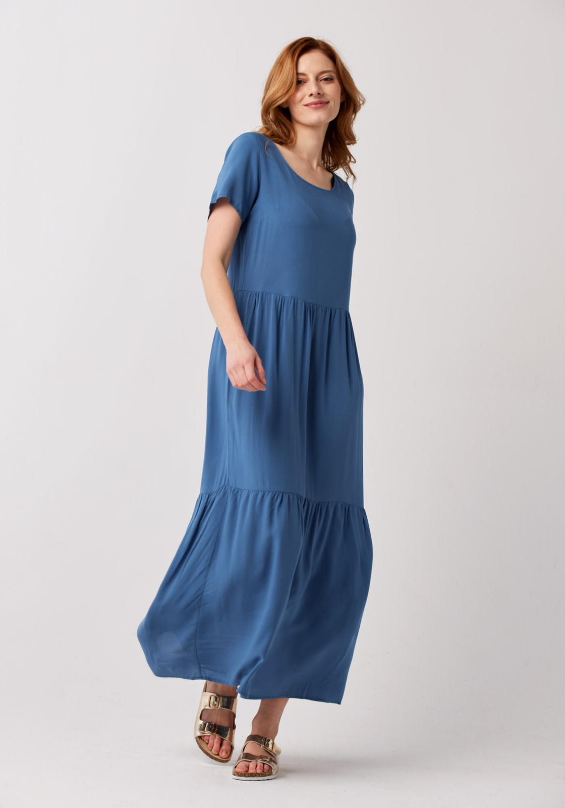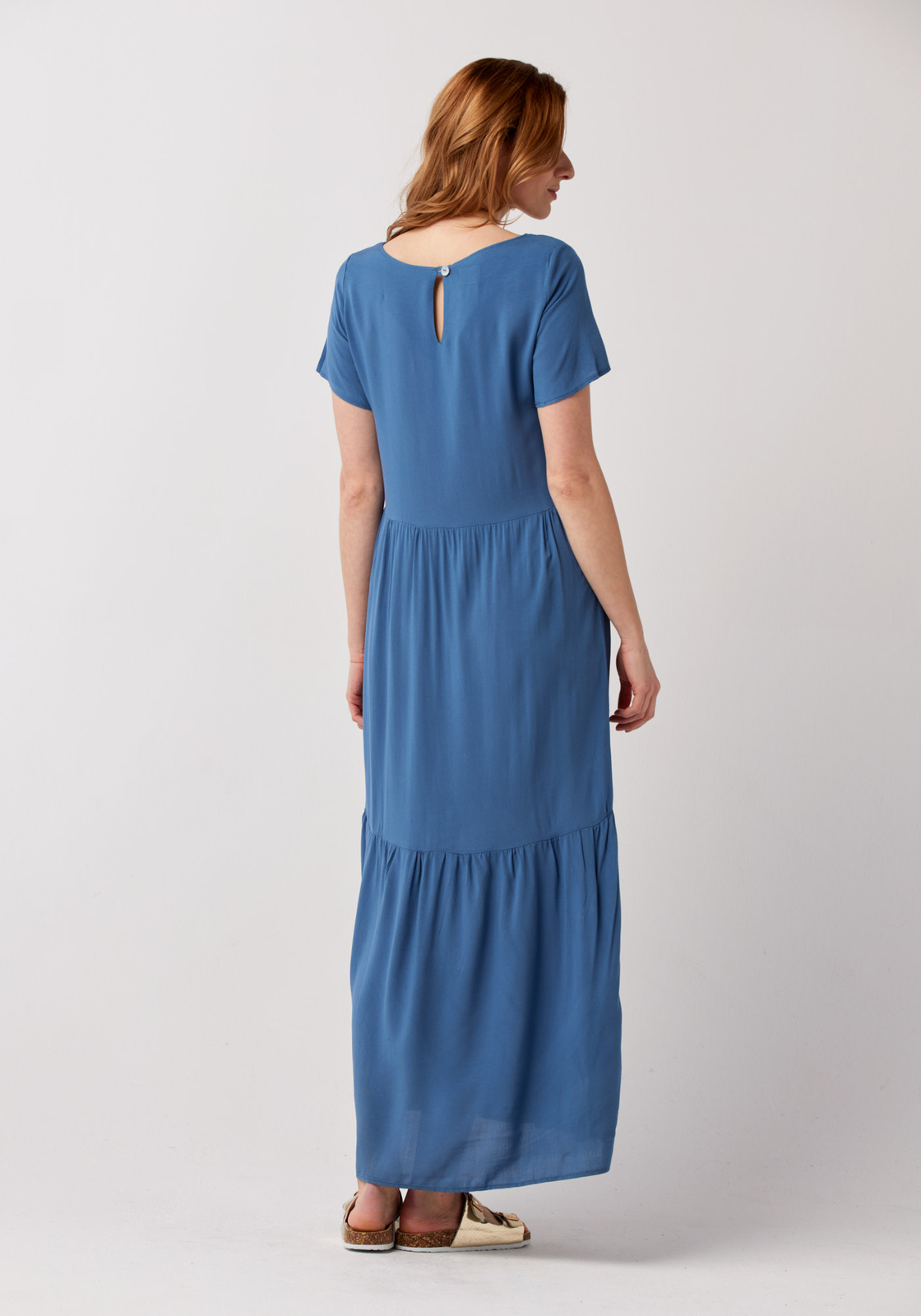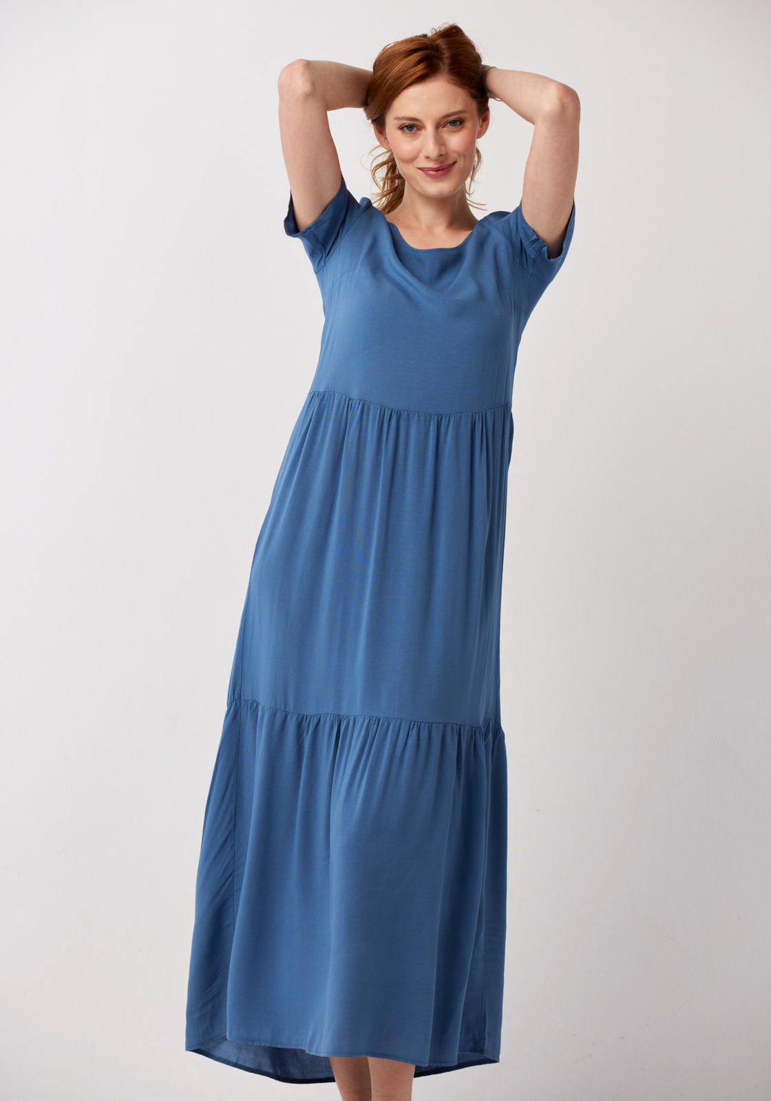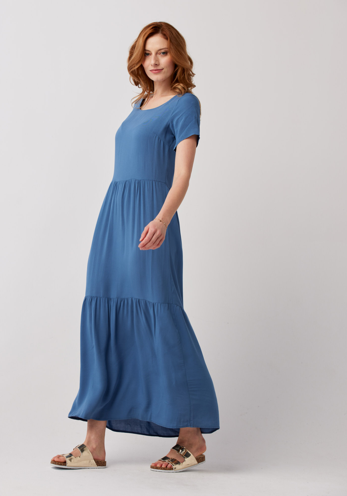 - Niebieska sukienka o długości maxi, ma swobodny krój, krótkie rękawy. Sukienka jest w kolorze zgaszonego błękitu.