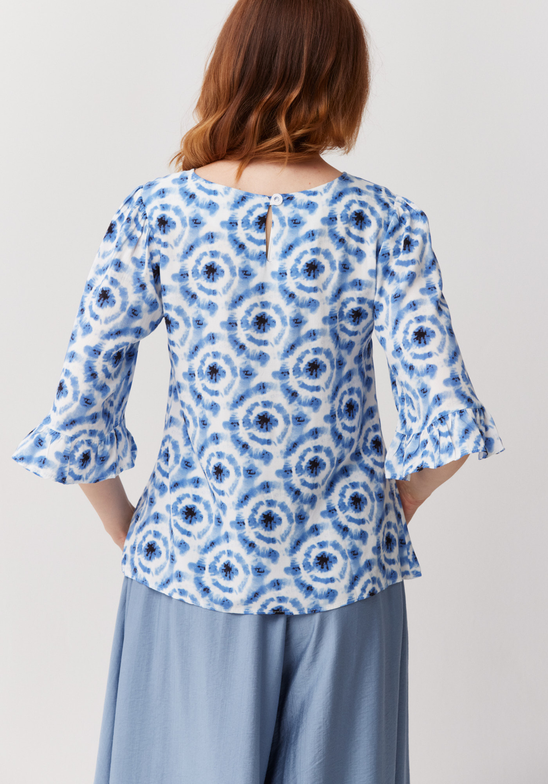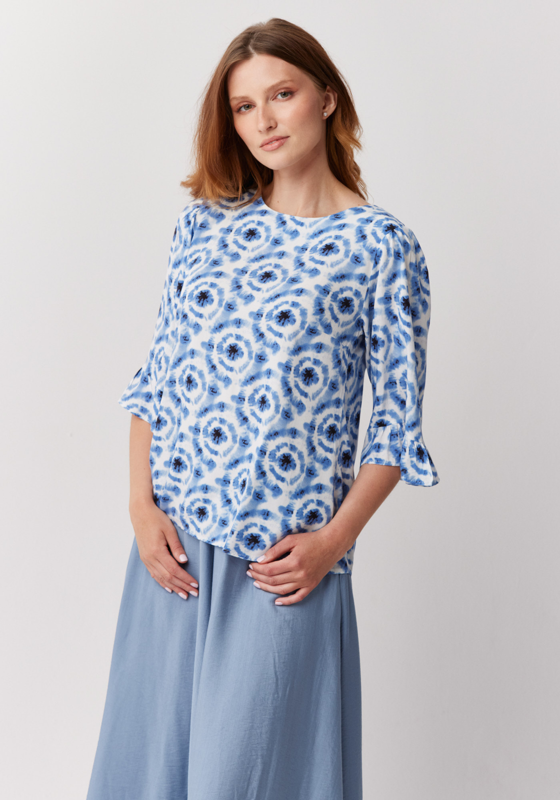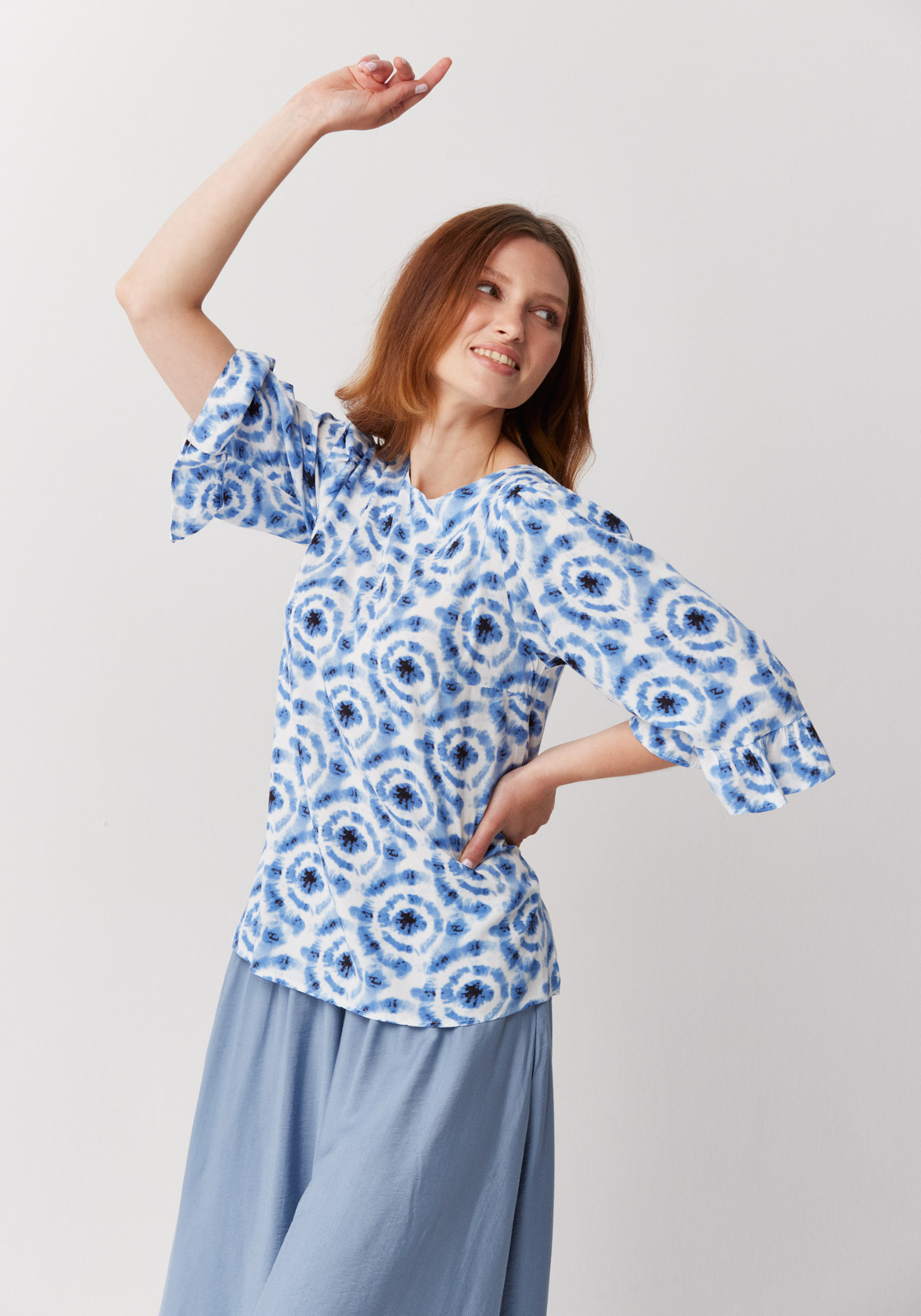- Biała bluzka z 3/4 rękawami zakończonymi falbanką. Bluzka w kółeczka w stylu tie-dye. Wiskozowa, swobodna bluzka.