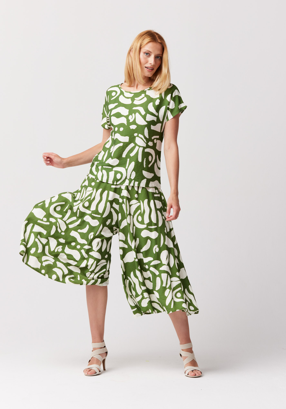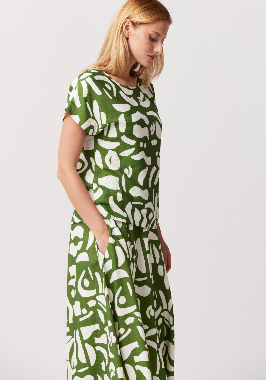 - Swobodna bluzka w kremowy wzór. Zielona bluzka tworząca komplet ze spodniami 5142.