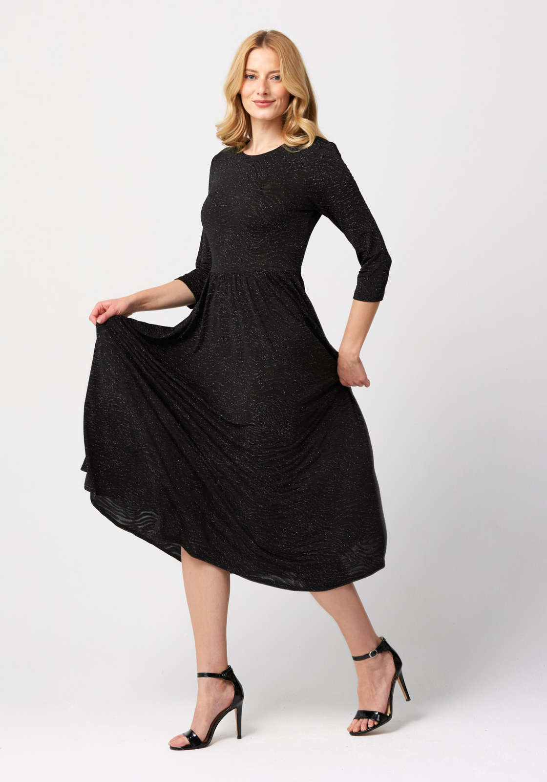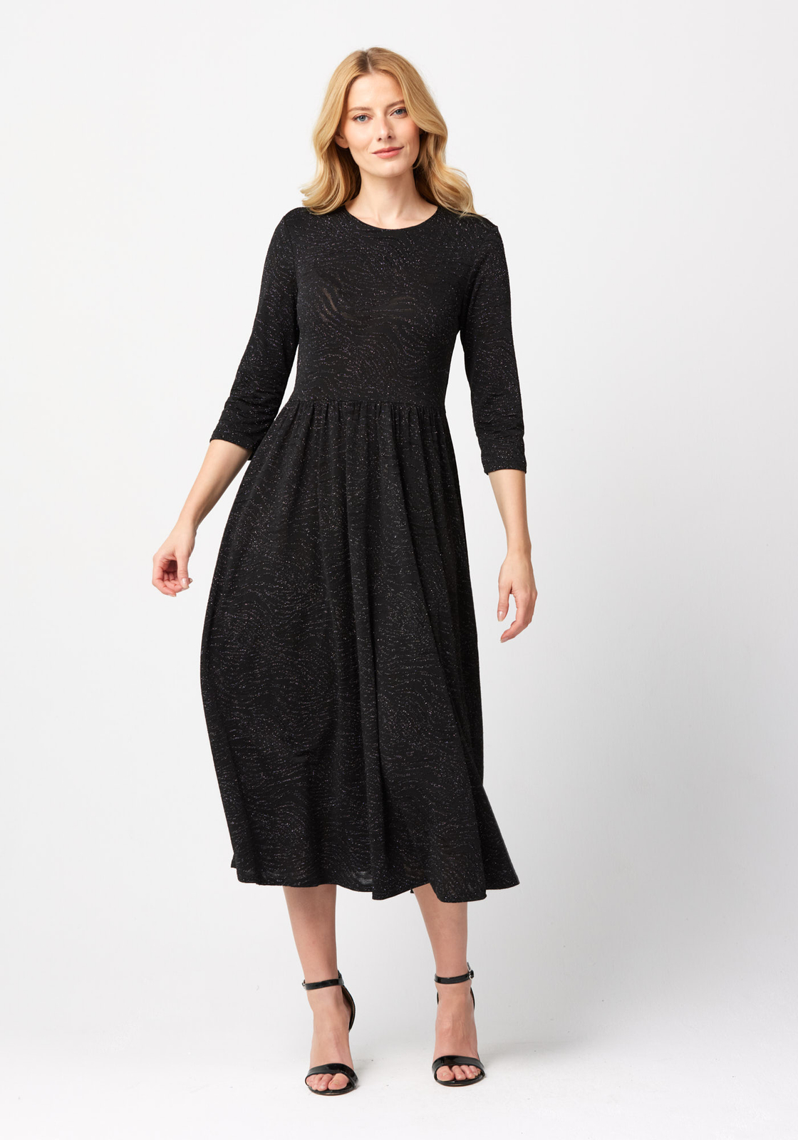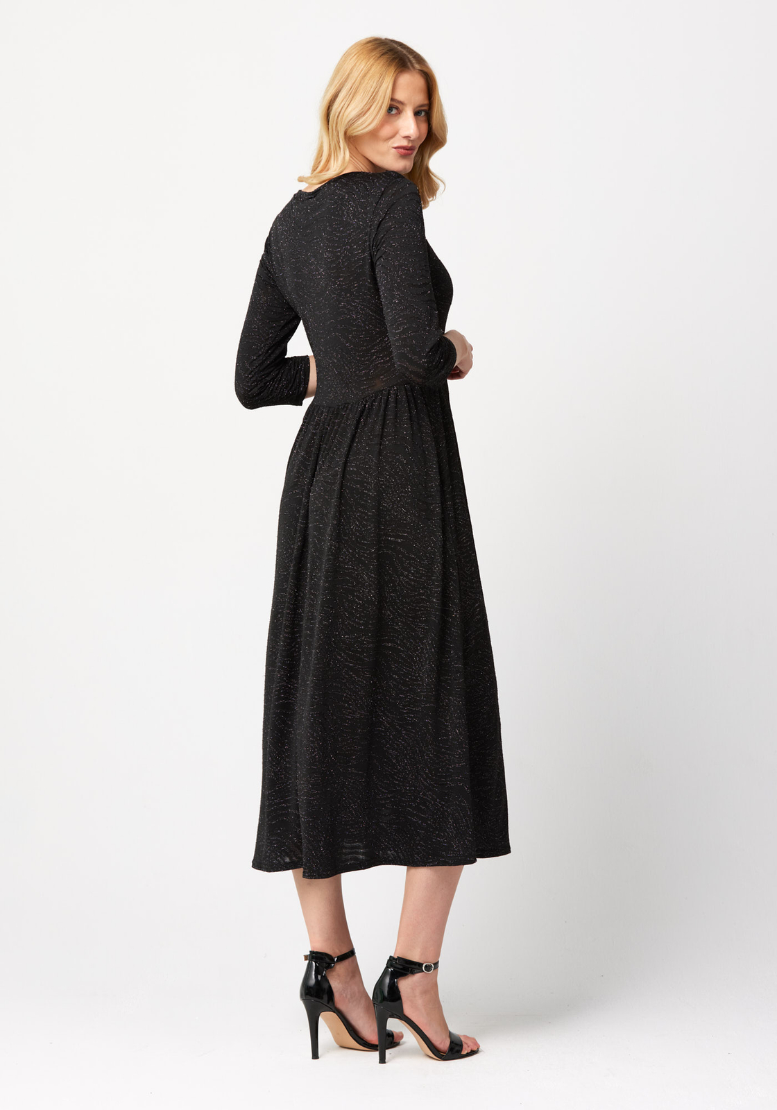 - Midi, błyszcząca sukienka o delikatnym wzorze. Mieniący się model podkreślający talię. Propozycja na wyjątkowe okazje z 3/4 rękawem.