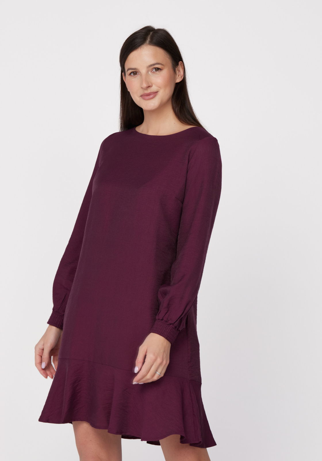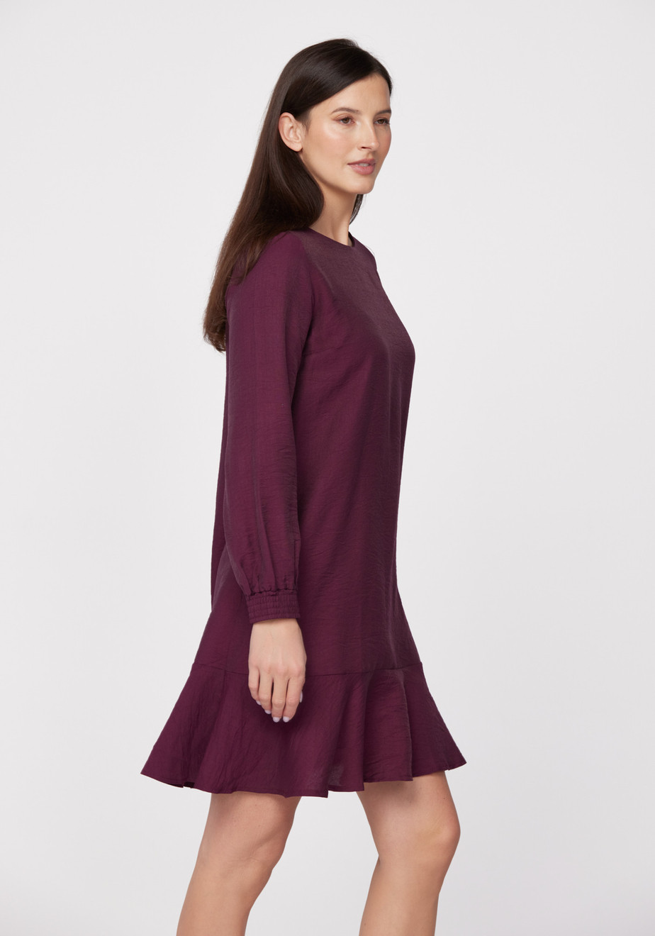 - Sukienka w kolorze wina z długimi rękawami o prostym fasonie wykończona zwiewną, szeroką falbaną.