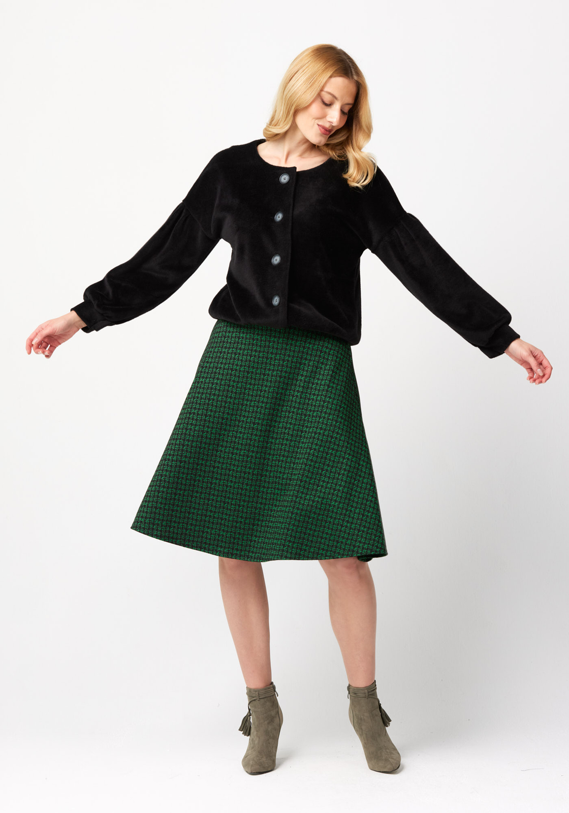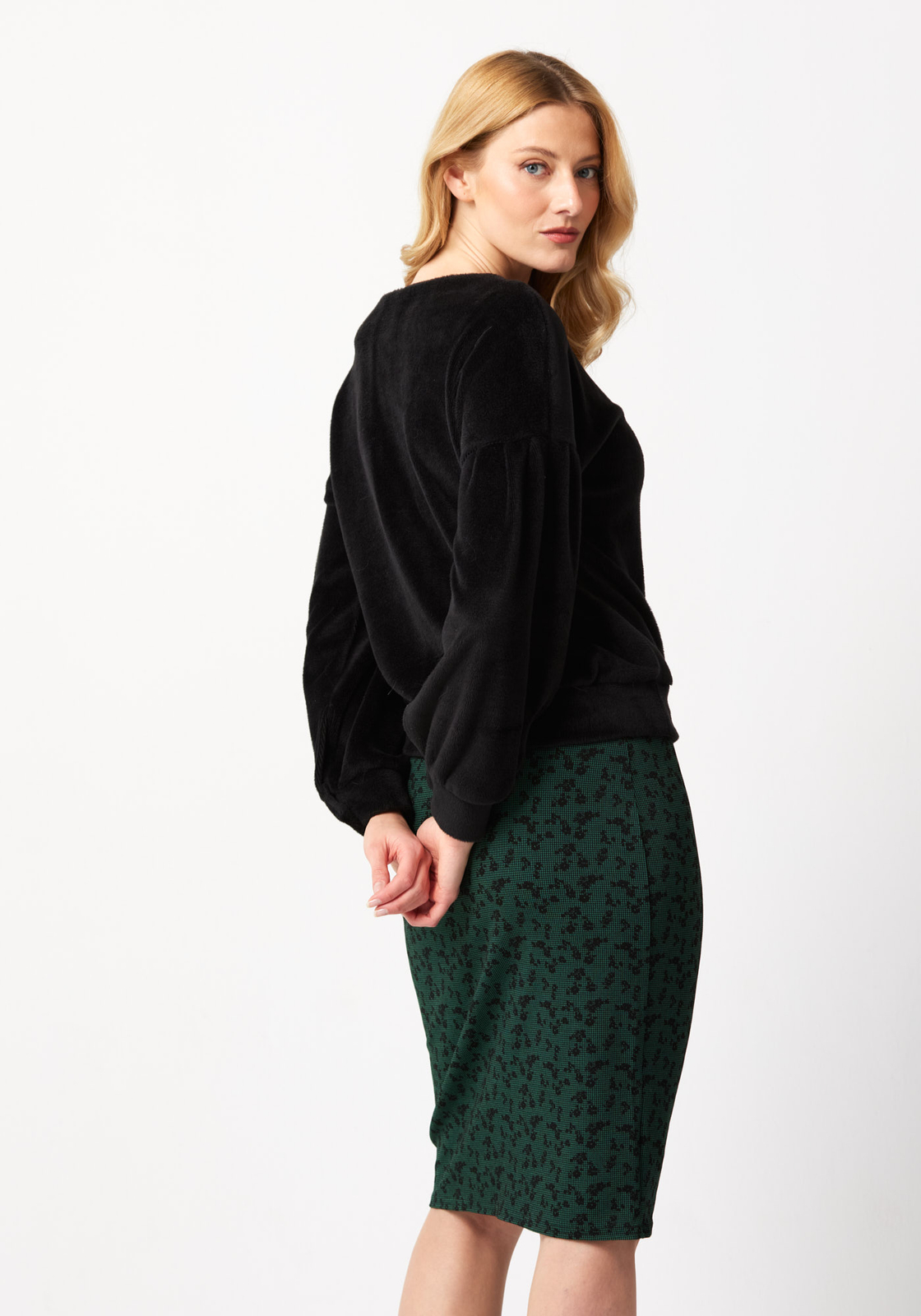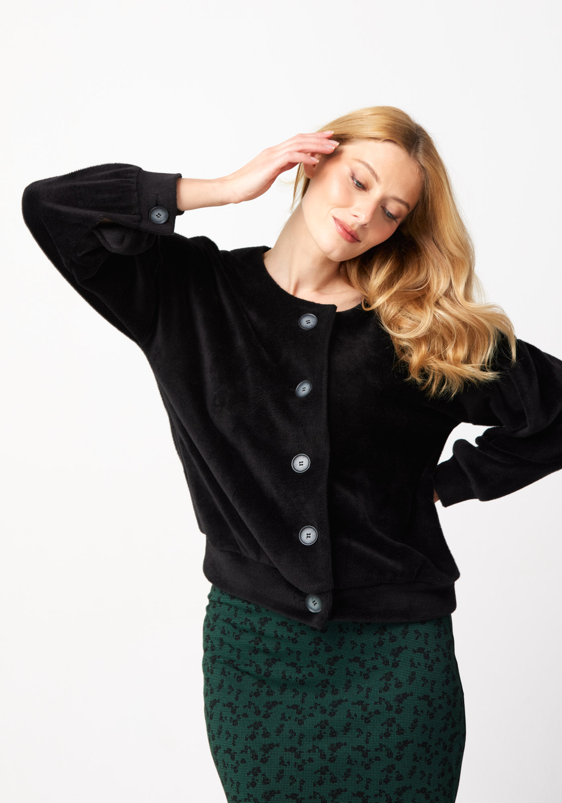 - Czarne futerko, swobodny żakiet uszyty z miękkiego, pluszowego materiału. Bluza z luźnymi rękawami. Zapięcie guzikowe.