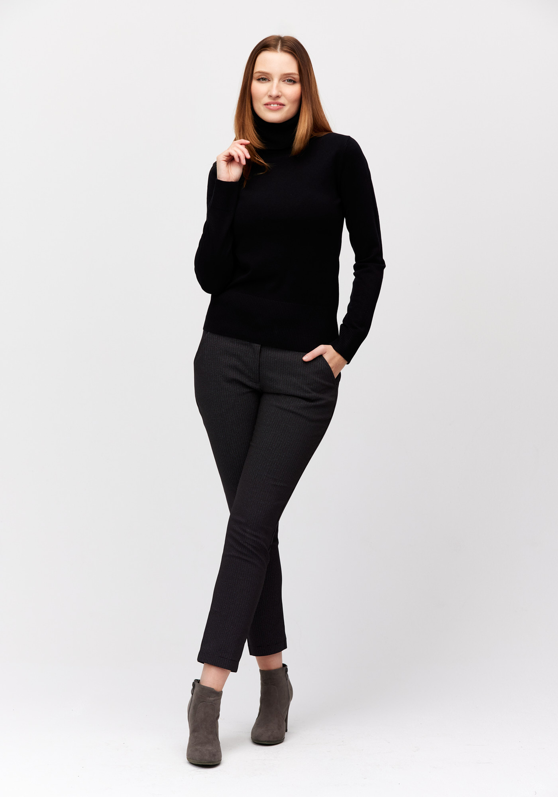 - Dopasowane spodnie z wyższym stanem. Spodnie mają wygodne kieszenie, są z czarnego lekko naddającego się materiału w drobny wzór.