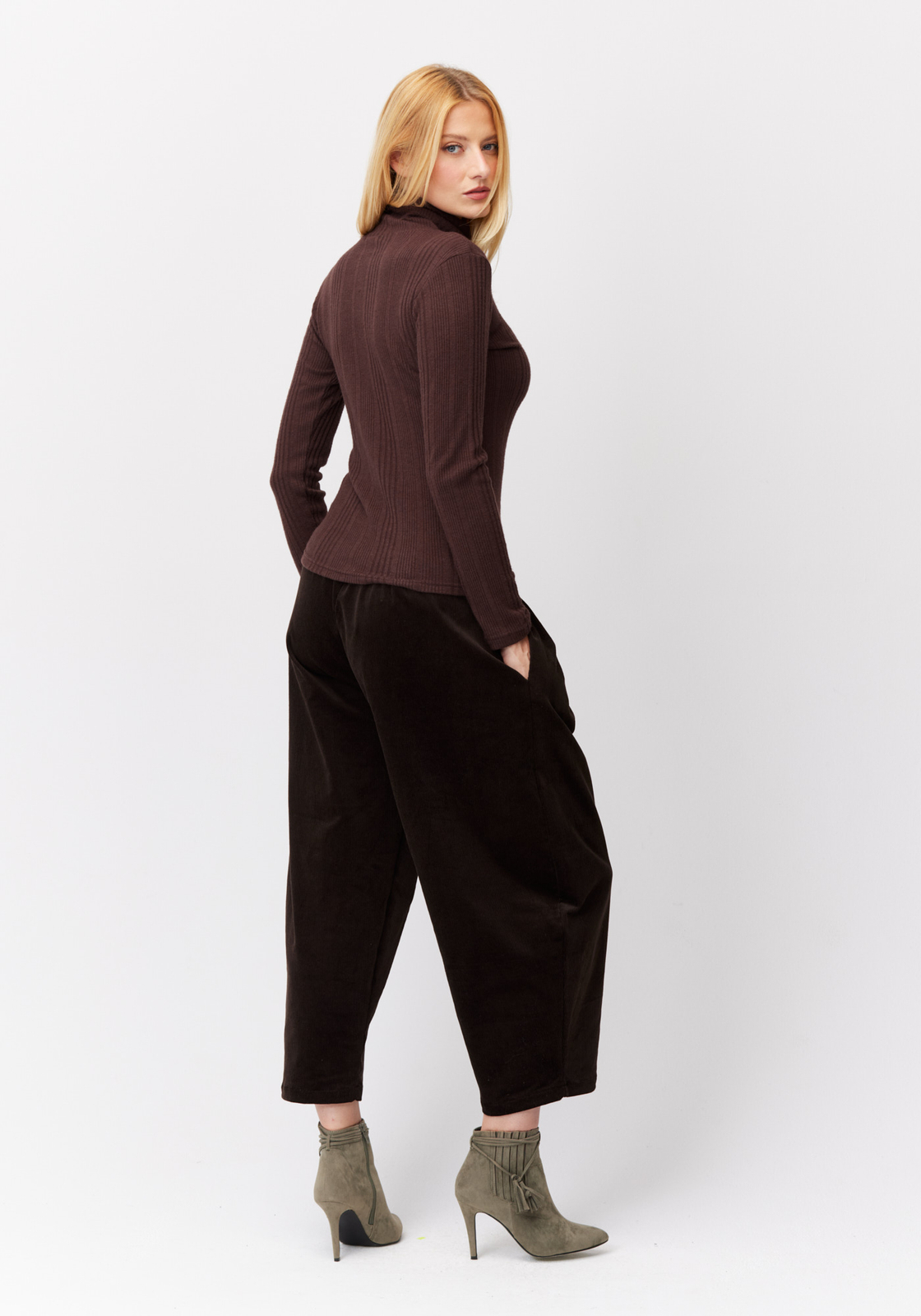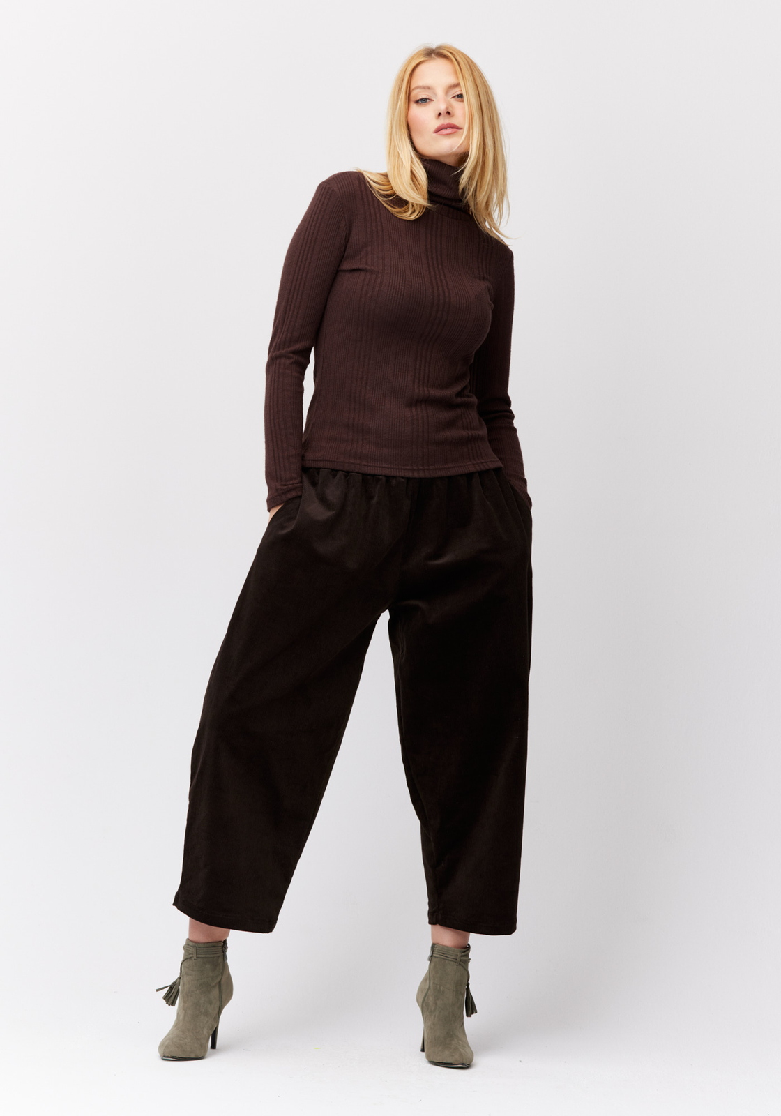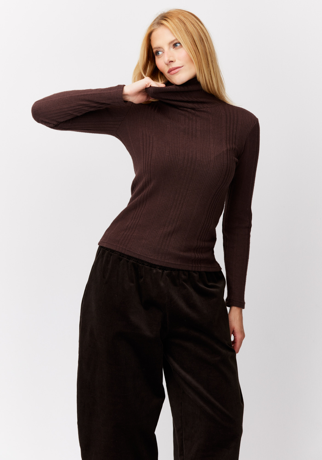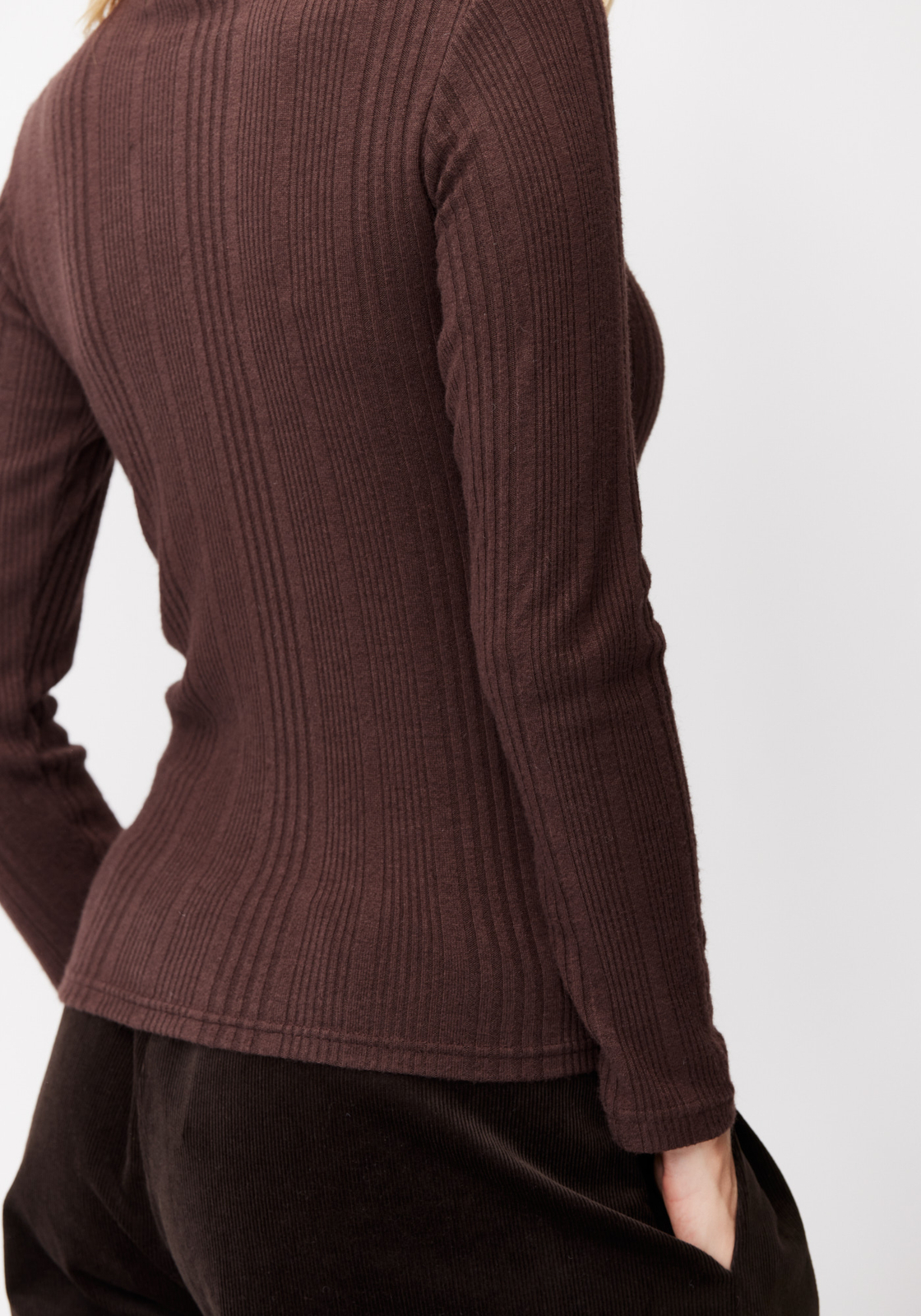 - Dopasowany golf w modnym w tym sezonie, czekoladowym kolorze. Prążkowany sweter podkreślający figurę.
