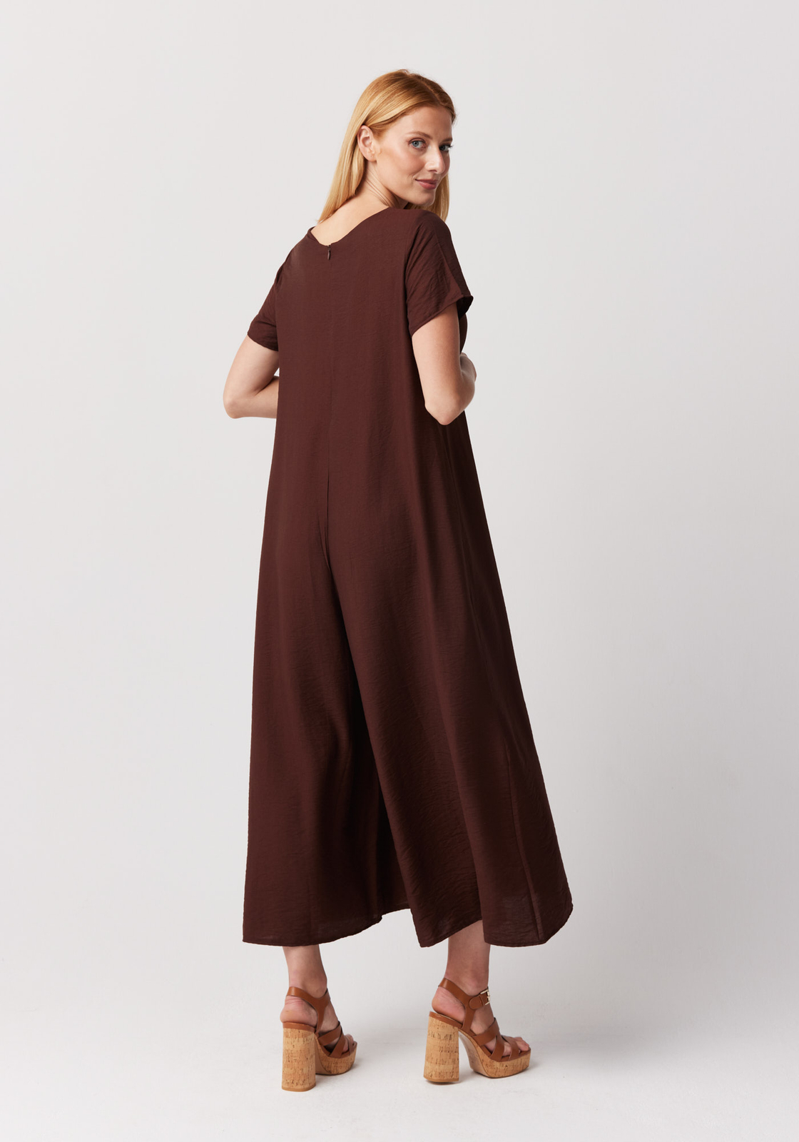 - Luźny kombinezon w modnym, czekoladowym kolorze. Kombinezon z krótkim rękawem.