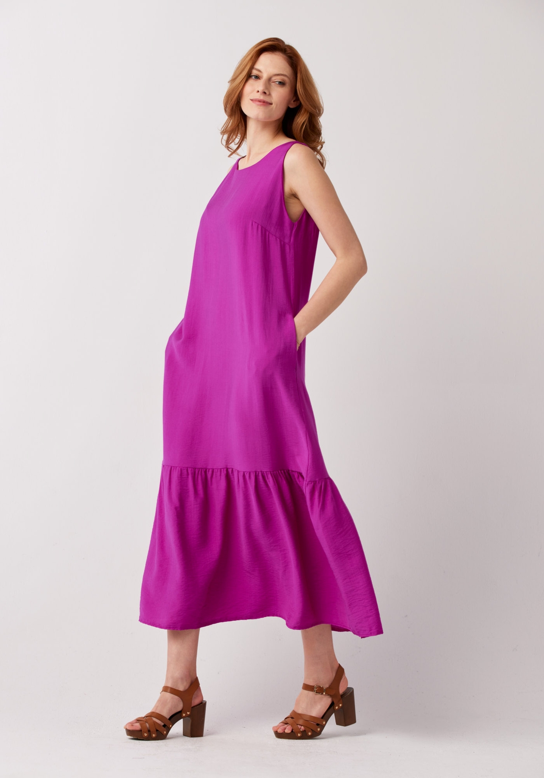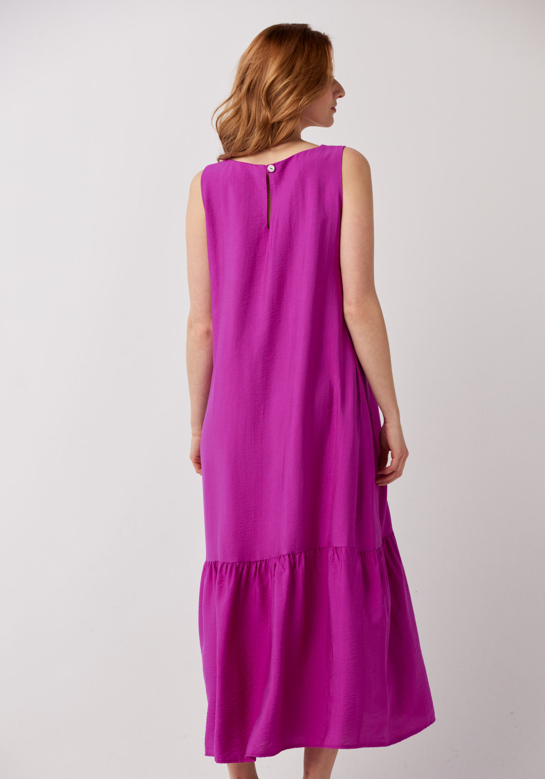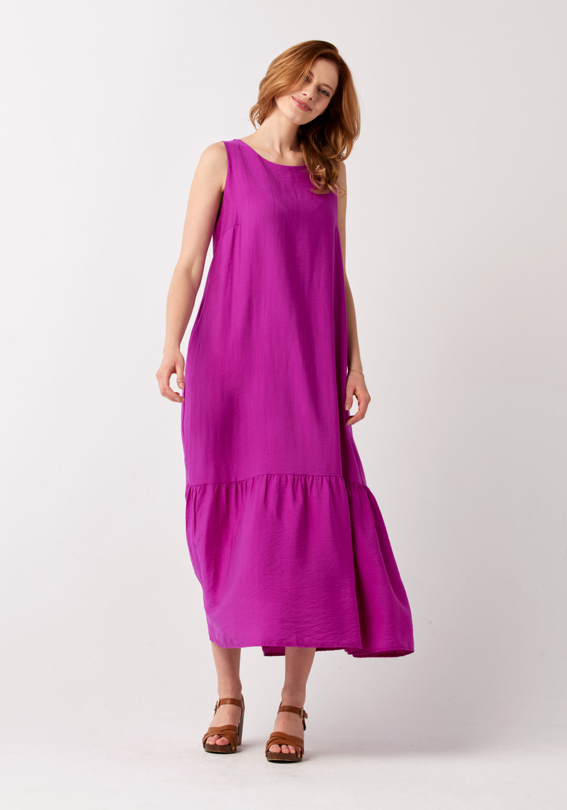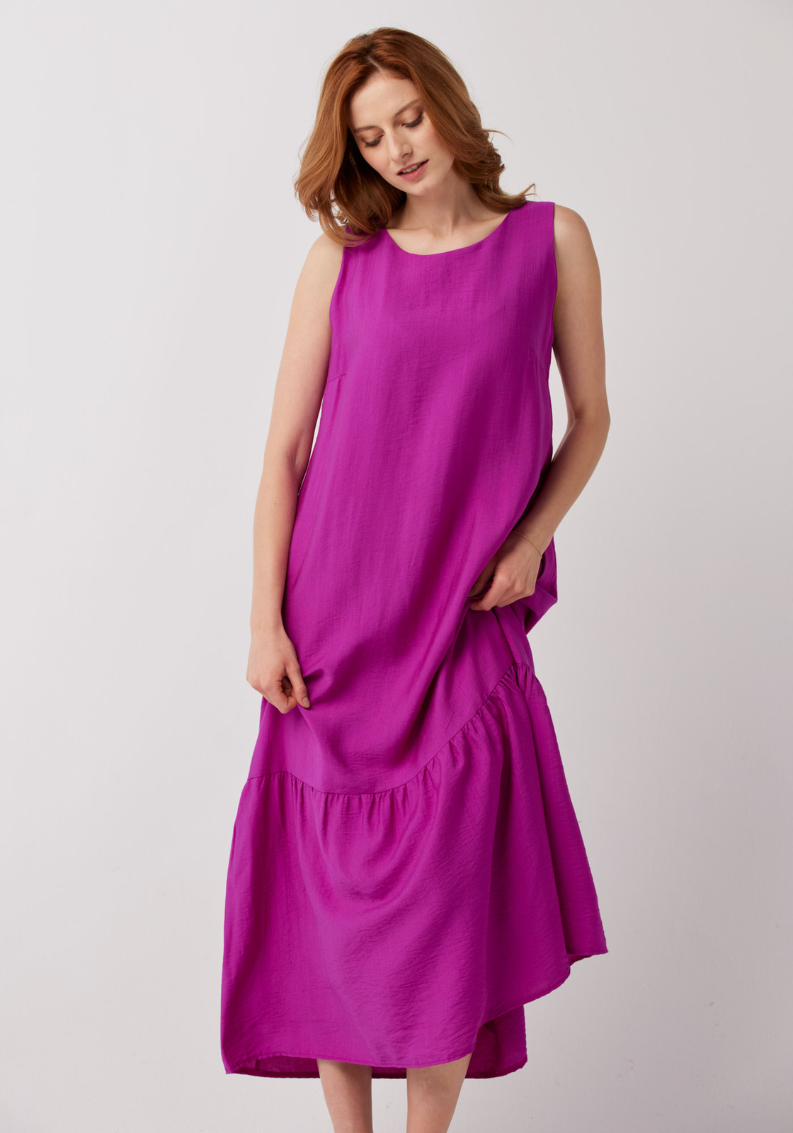 - Fuksjowa sukienka o długości maxi i swobodnym, luźnym kroju. Sukienka jest z cienkiego, zwiewnego materiału, jest na szerokich ramiączkach. Sukienka w kolorze nasyconego, pełnego energii różu.