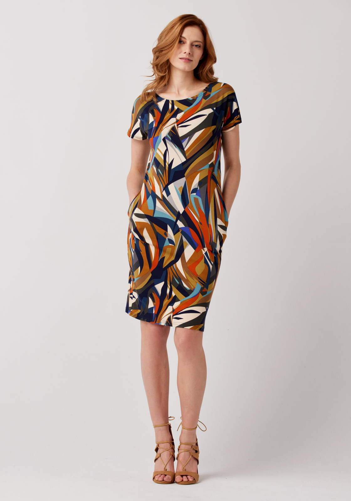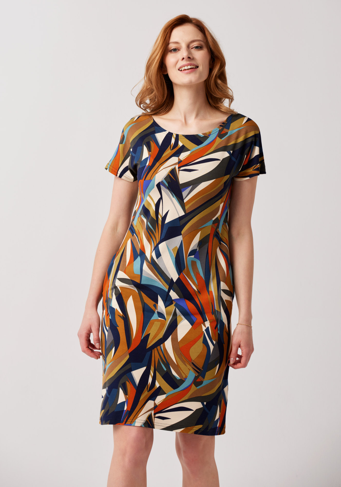 - Dopasowana kolorowa sukienka. Sukienka z krótkim rękawem i rozcięciem na plecach. Sukienka z kieszeniami.