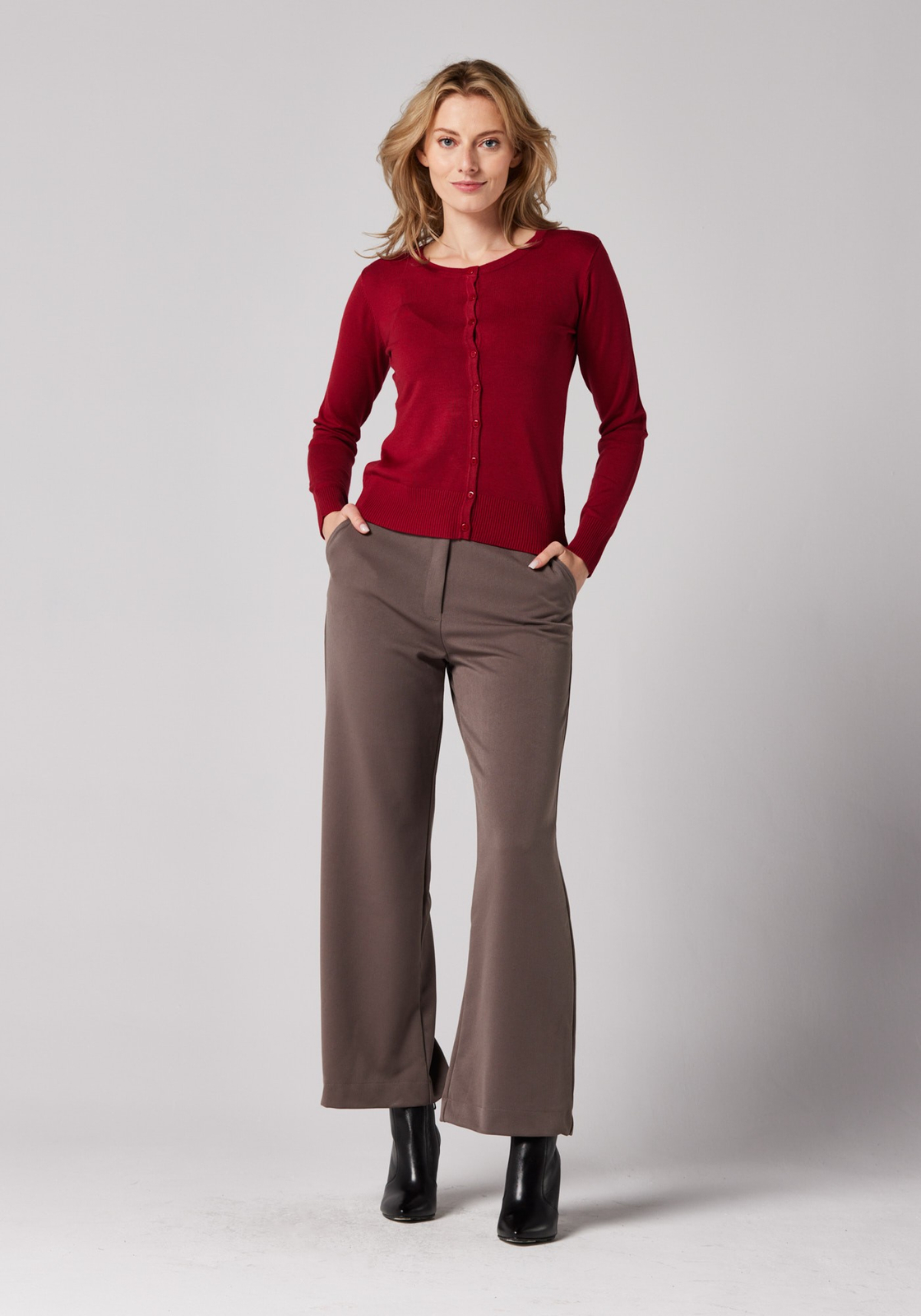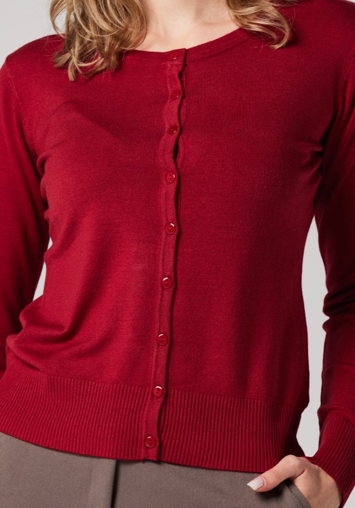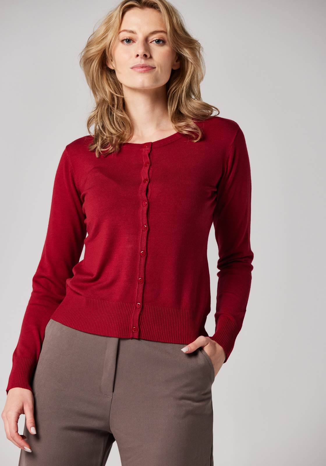 - Klasyczny, rozpinany sweter w kolorze ciemnoczerwonym z długimi rękawami.