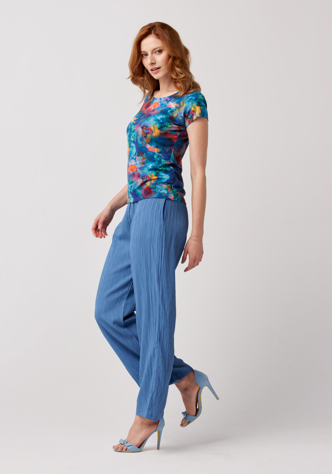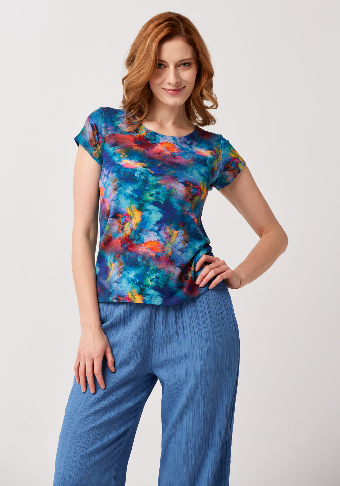 - Bluzka z krótkimi rękawami z miękkiego materiału wiskozowego. Bluzka jest wielokolorowa.