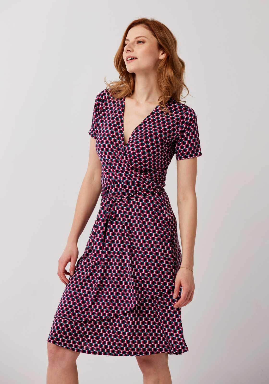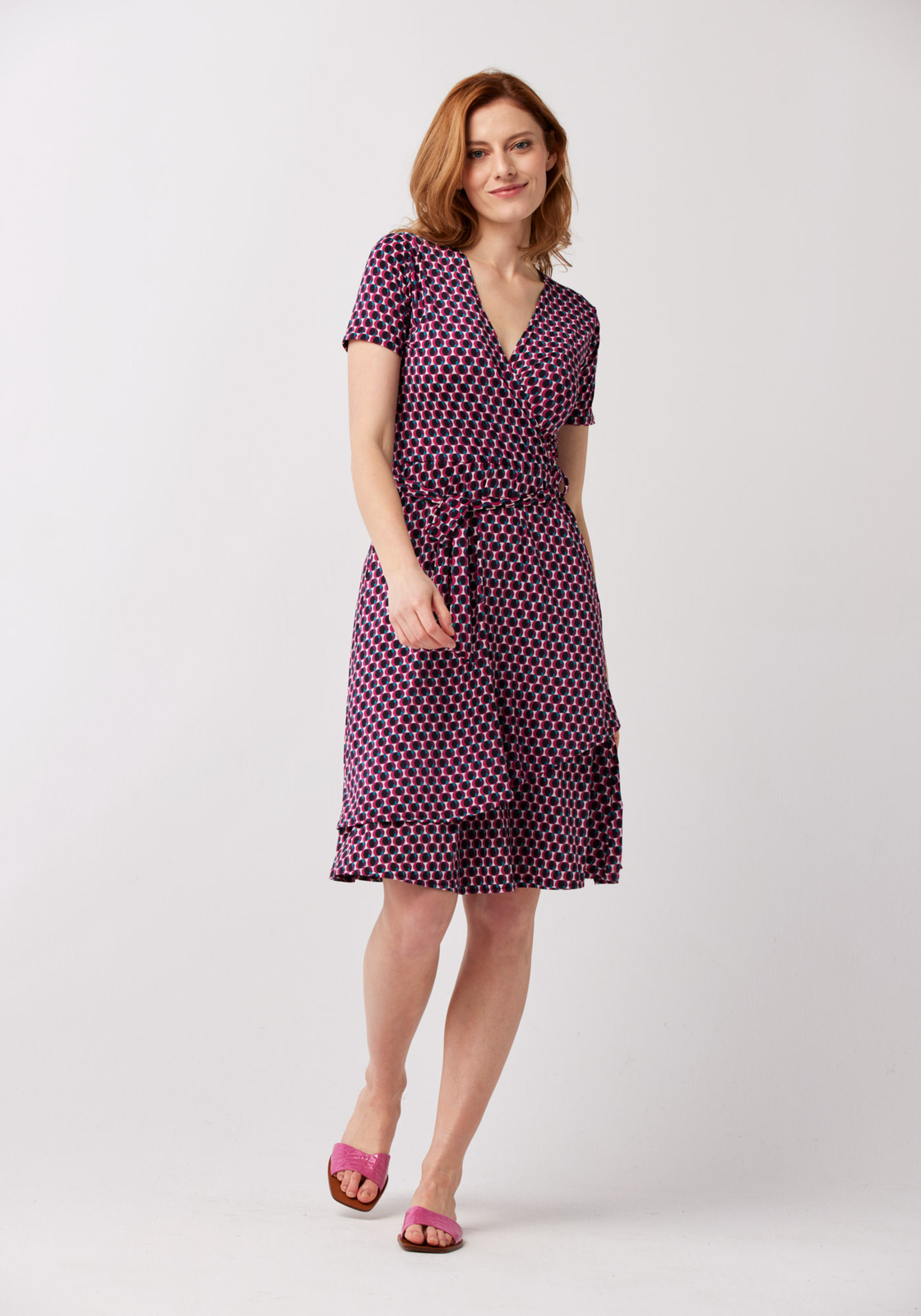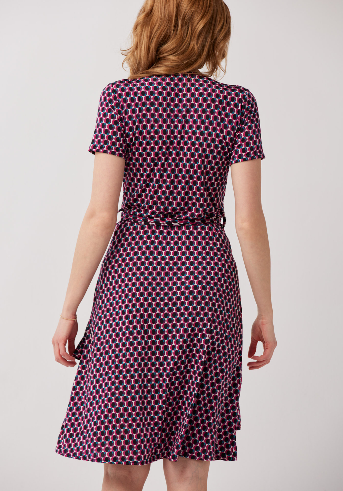- Wiązana w talii, kopertowa sukienka z krótkim rękawem. Sukienka w różowy, geometryczny wzór. Sukienka posiada dekolt w serek oraz asymetryczny dół.