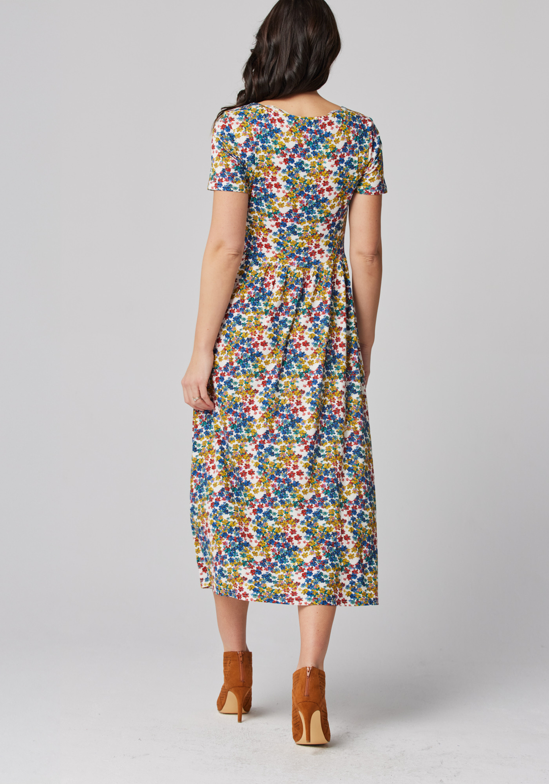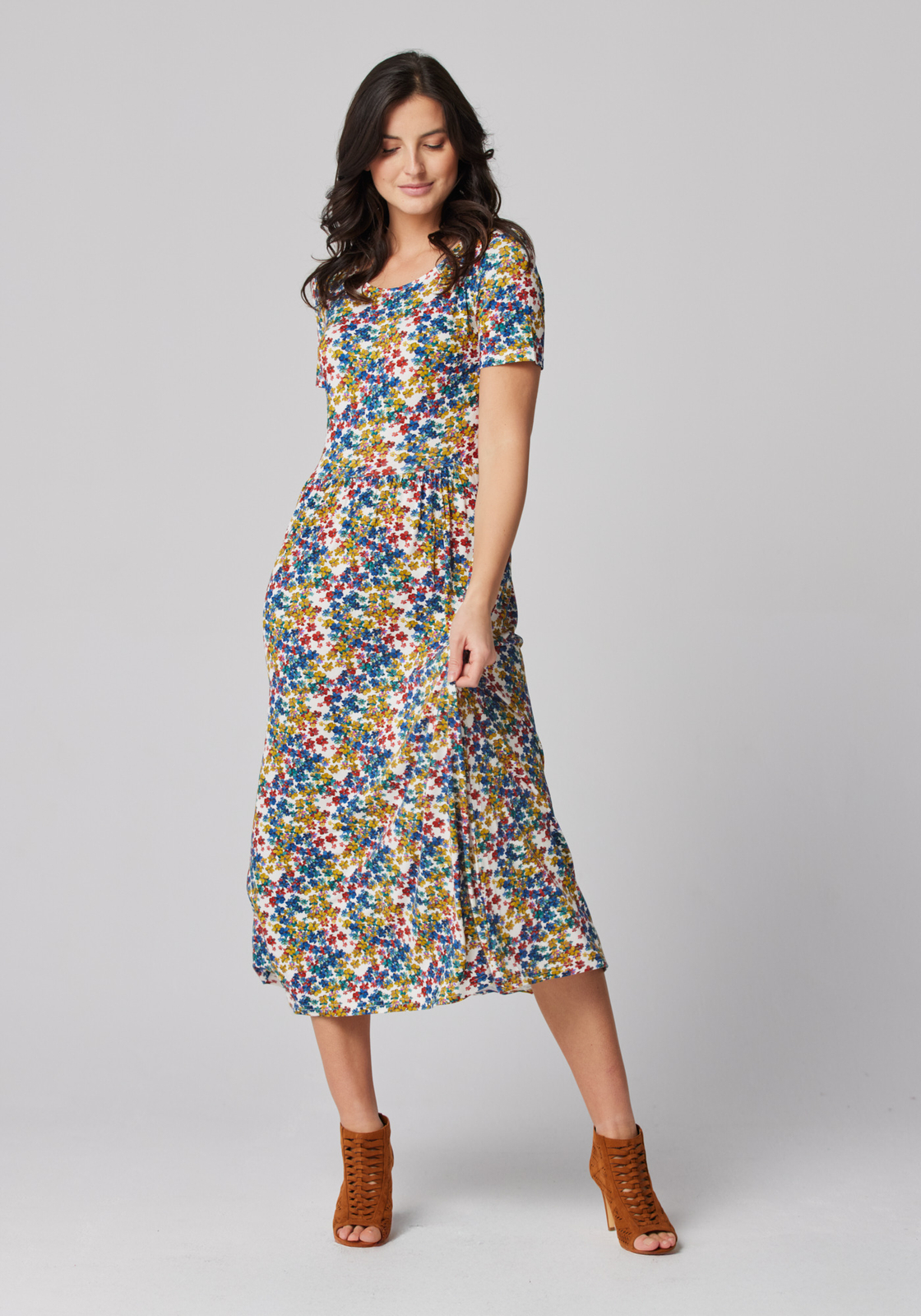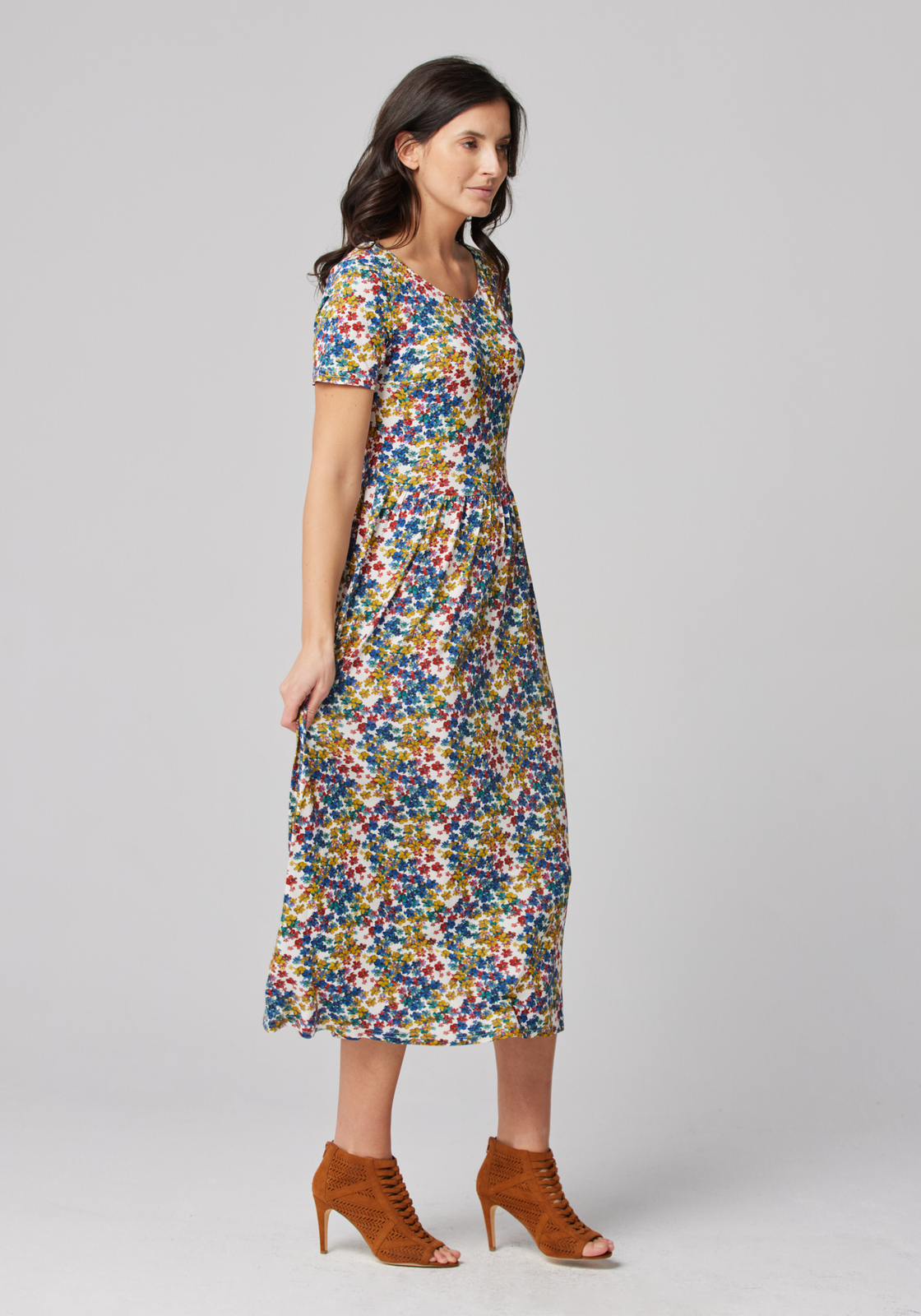 - Odcinana w talii sukienka z midi spódnicą. Kremowa sukienka w kolorowe kwiaty. Kwiatowy deseń oraz krótki rękaw idealnie sprawdzą się na cieplejsze dni.