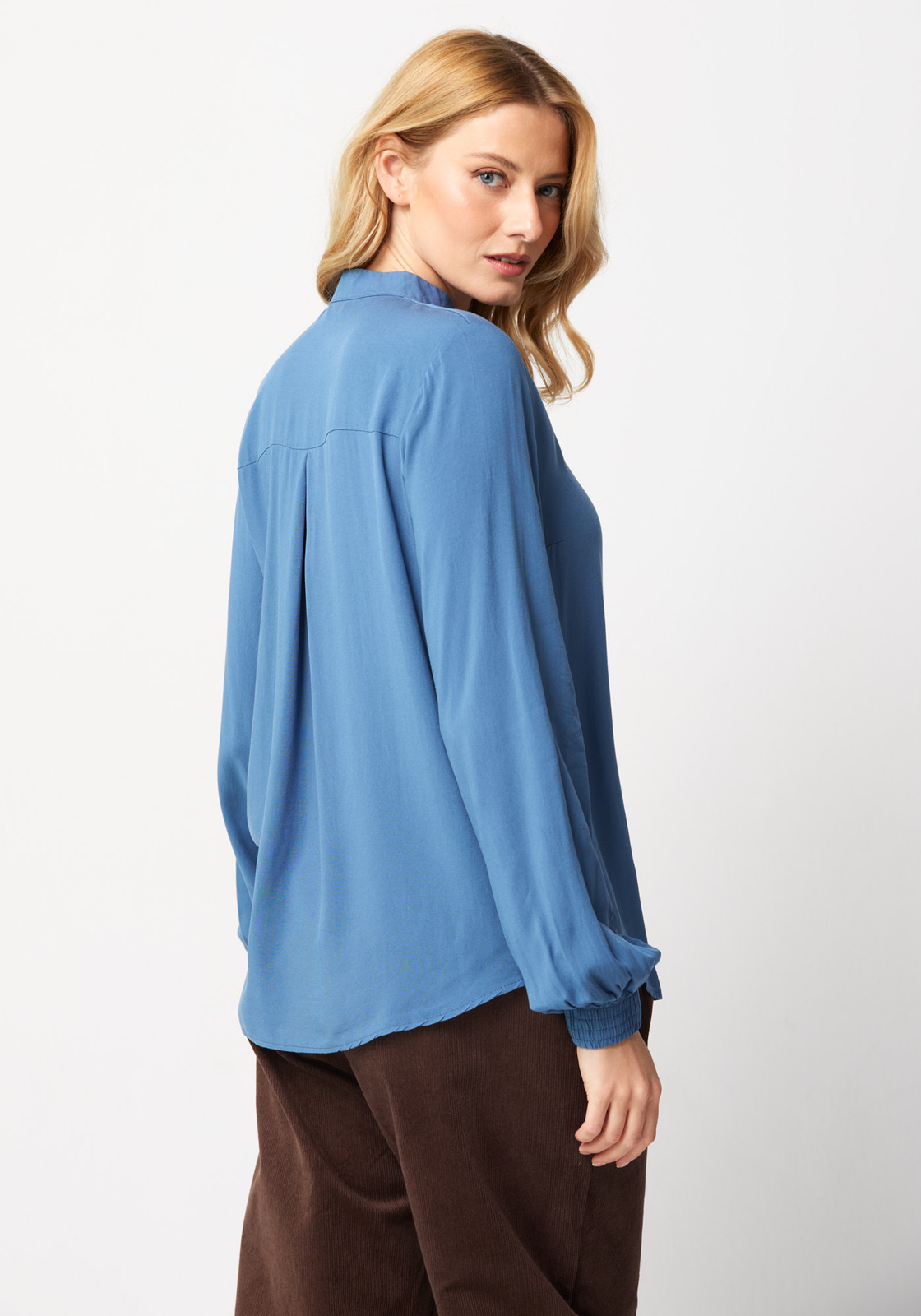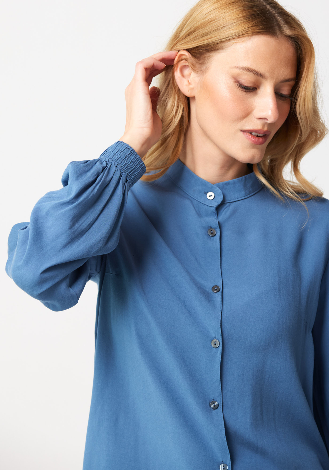 - Swobodna, niebieska koszula z wiskozy. Lekka koszula ze stójką z zwężanymi rękawami zakończonymi elastyczną gumką. Koszula w kolorze zgaszonego błękitu.