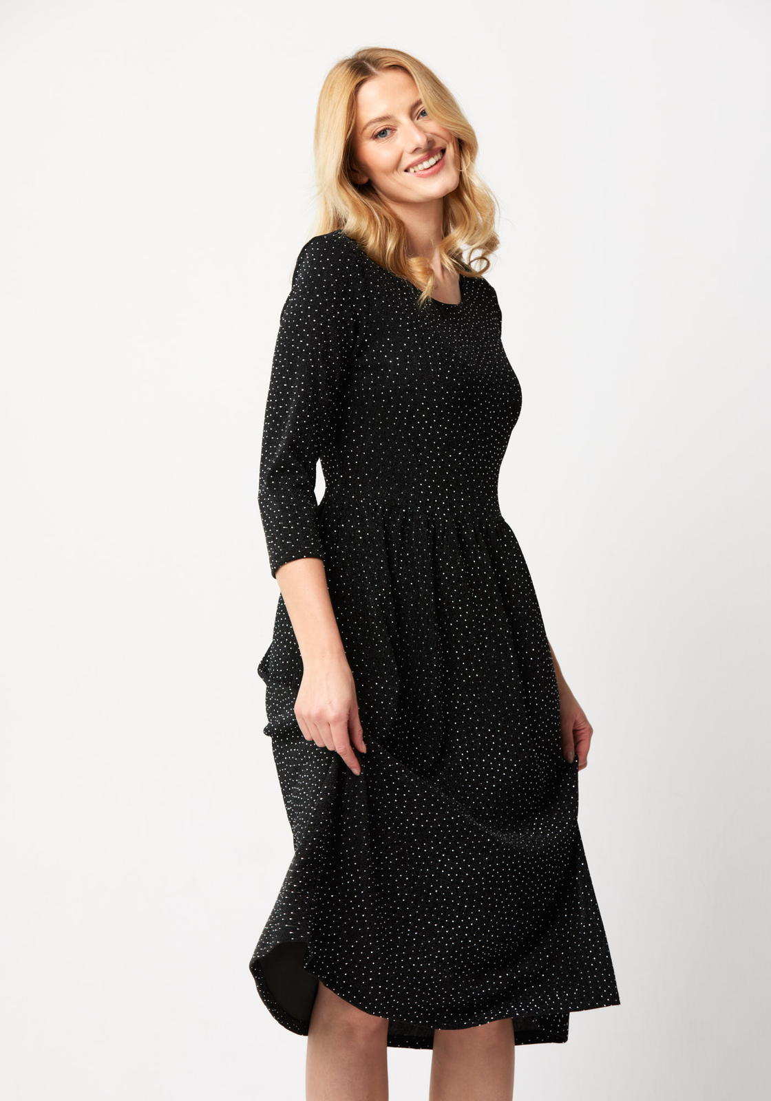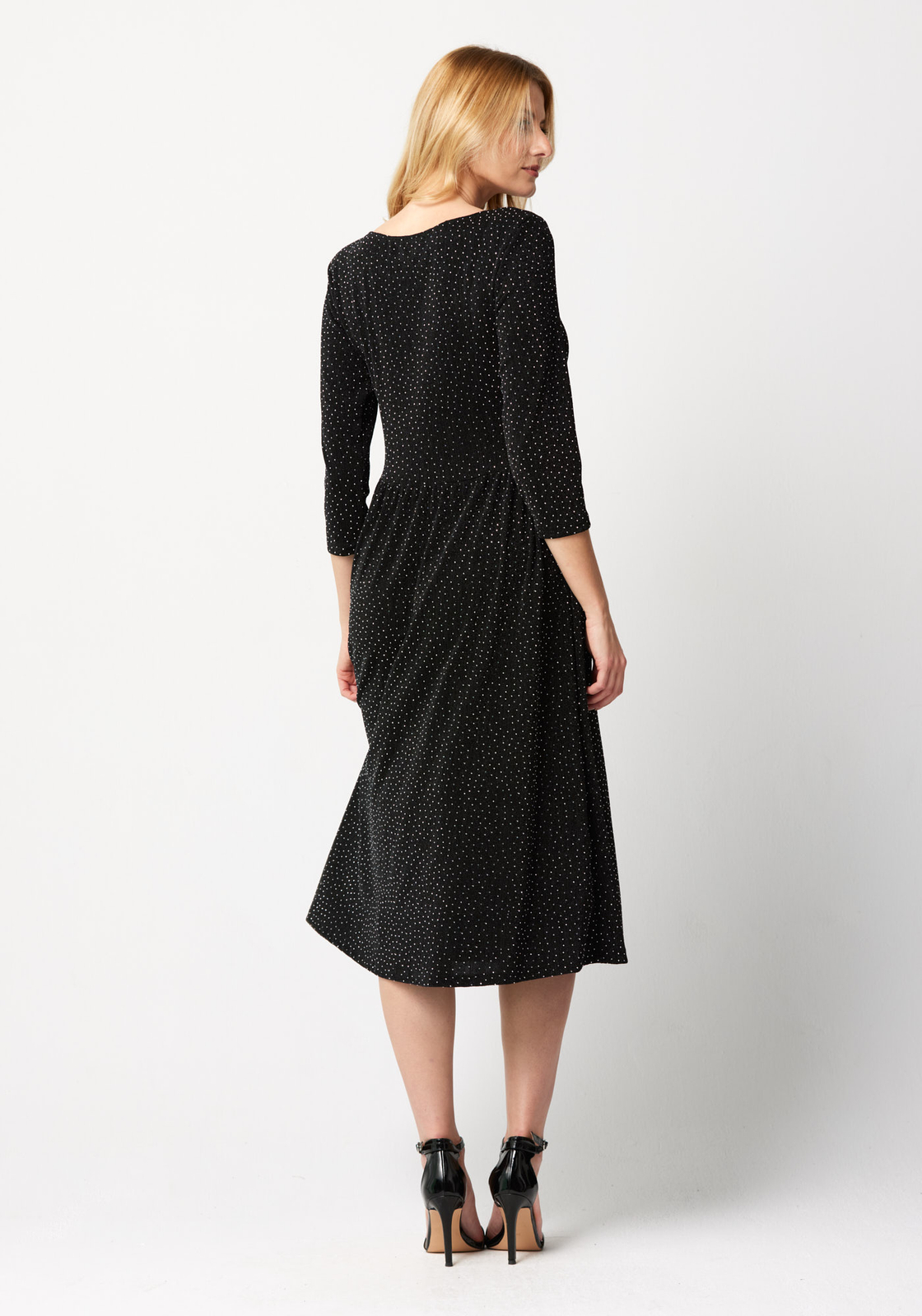 - Odcinana w talii, czarna sukienka w srebrne groszki. Sukienka z rozkloszowaną spódnicą i 3/4 rękawami.