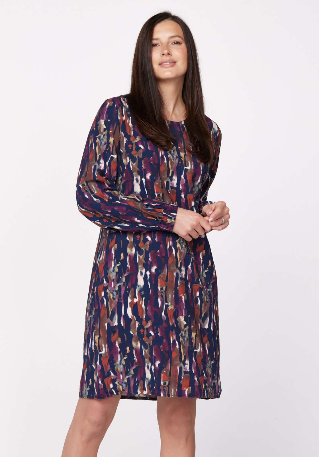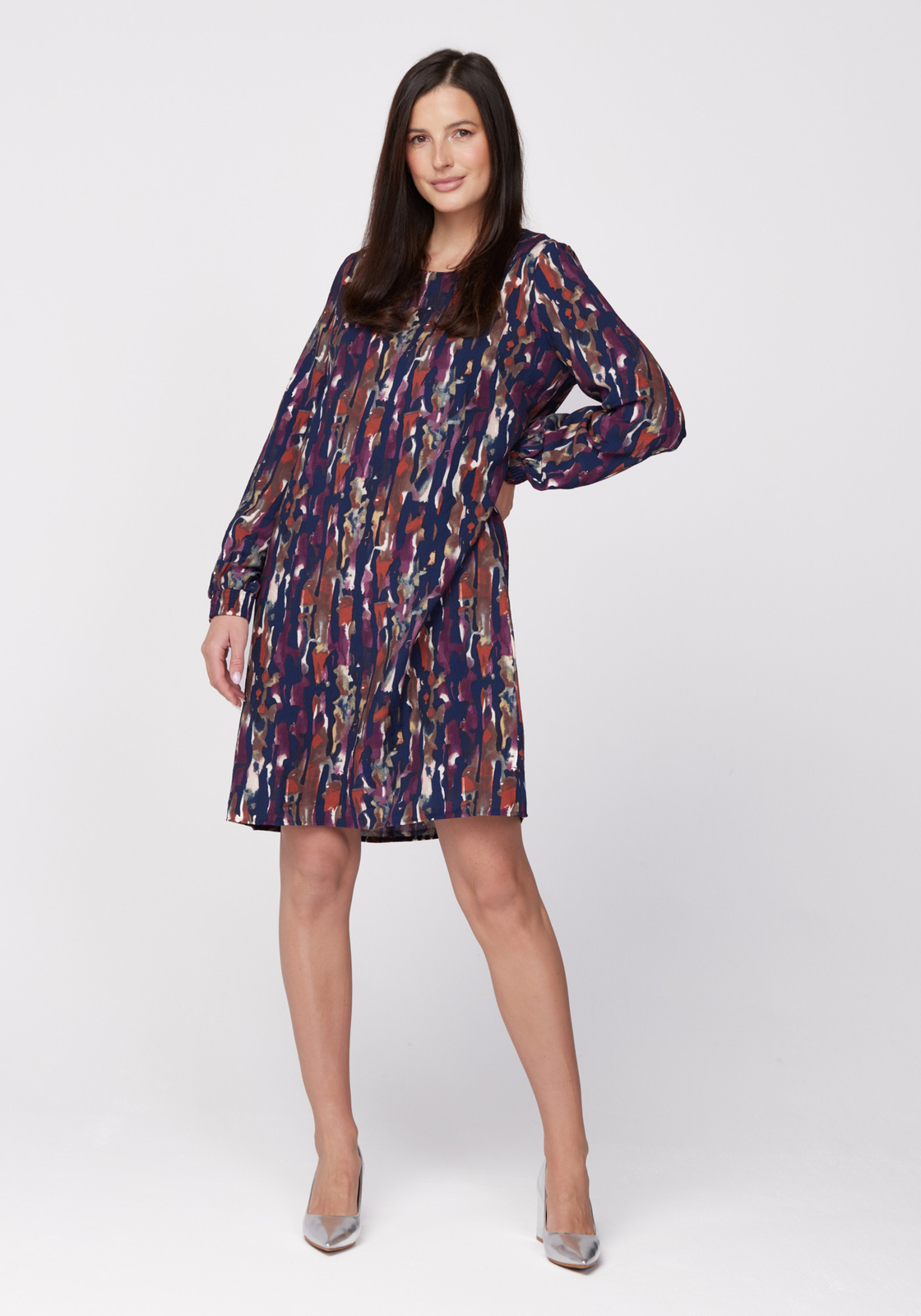 • Sukienka o prostym kroju, swobodna, z długimi rękawami wykończonymi delikatnymi gumkami. Sukienka jest z cienkiego materiału w odcieniach fioletu i granatu.