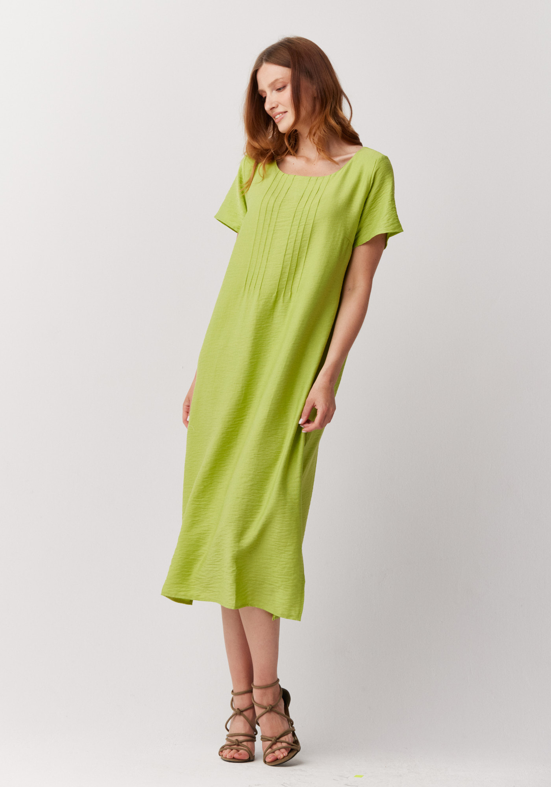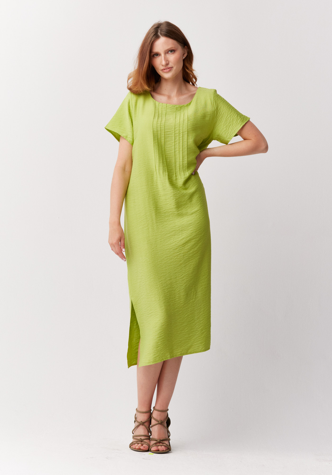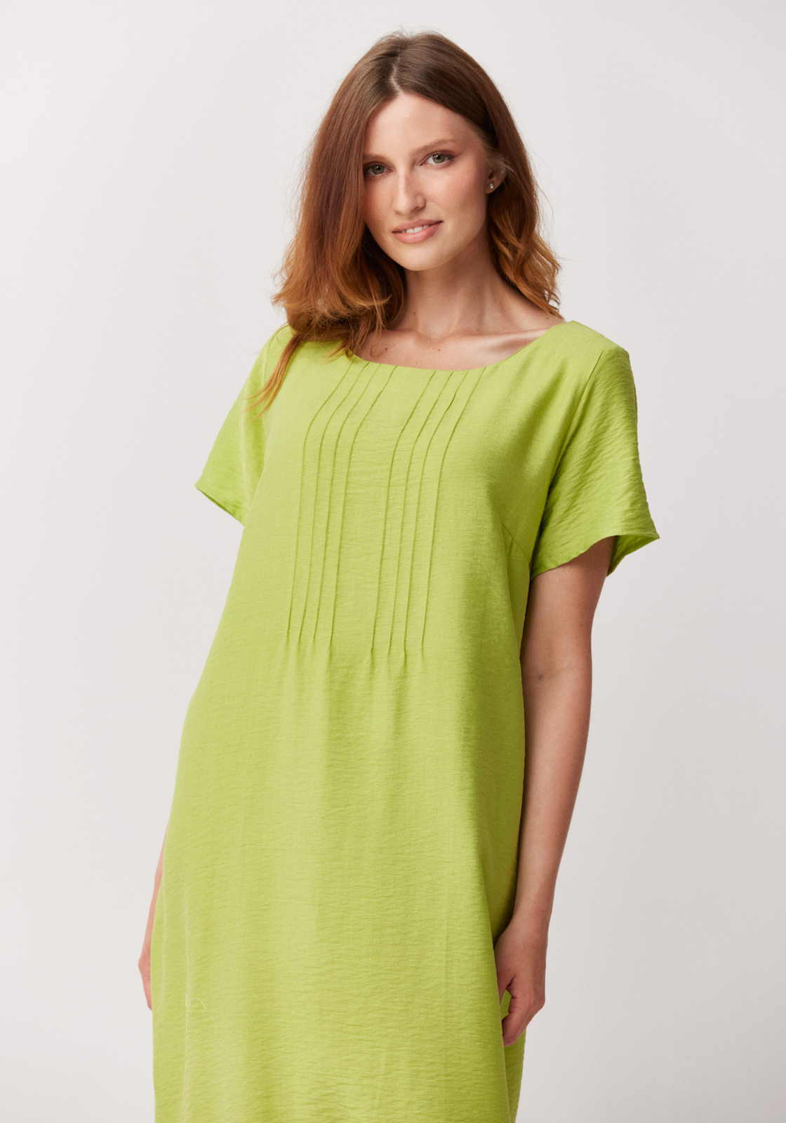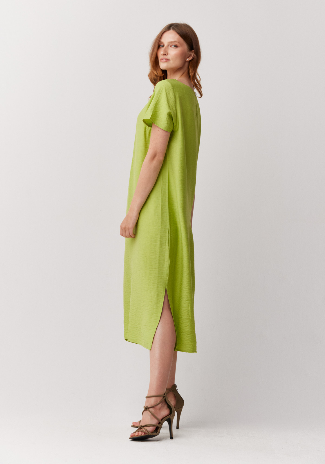 - Lekka, jasnozielona sukienka z krótkim rękawem. Swobodna sukienka z niewielkimi rozcięciami po bokach i ozdobnym akcentem na dekolcie.