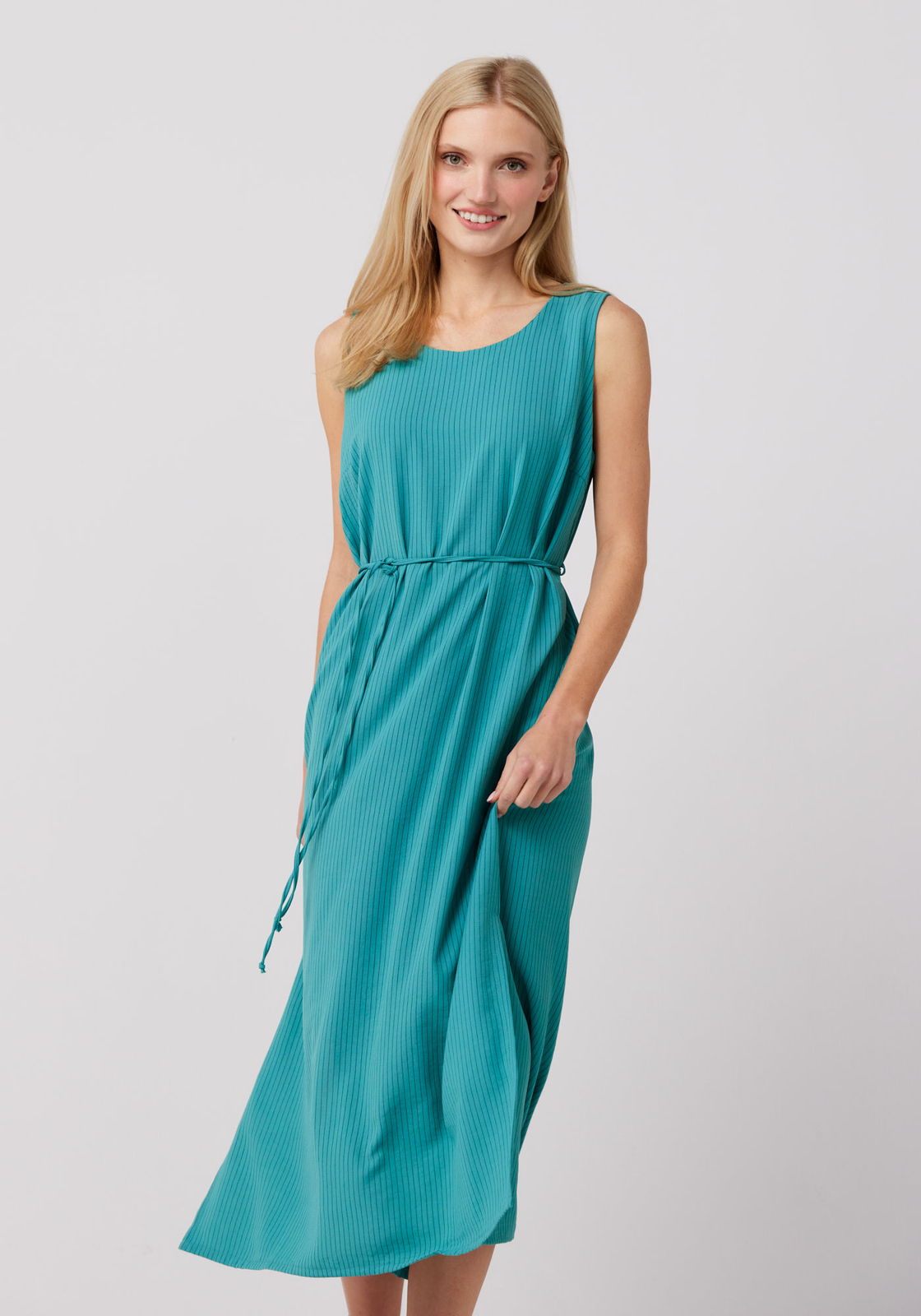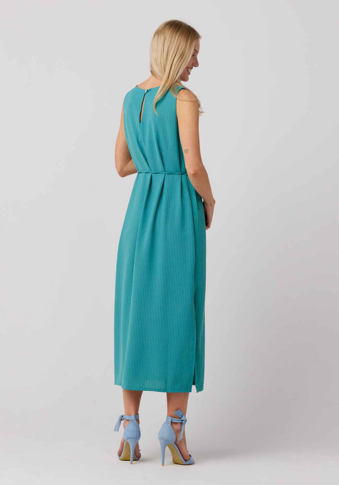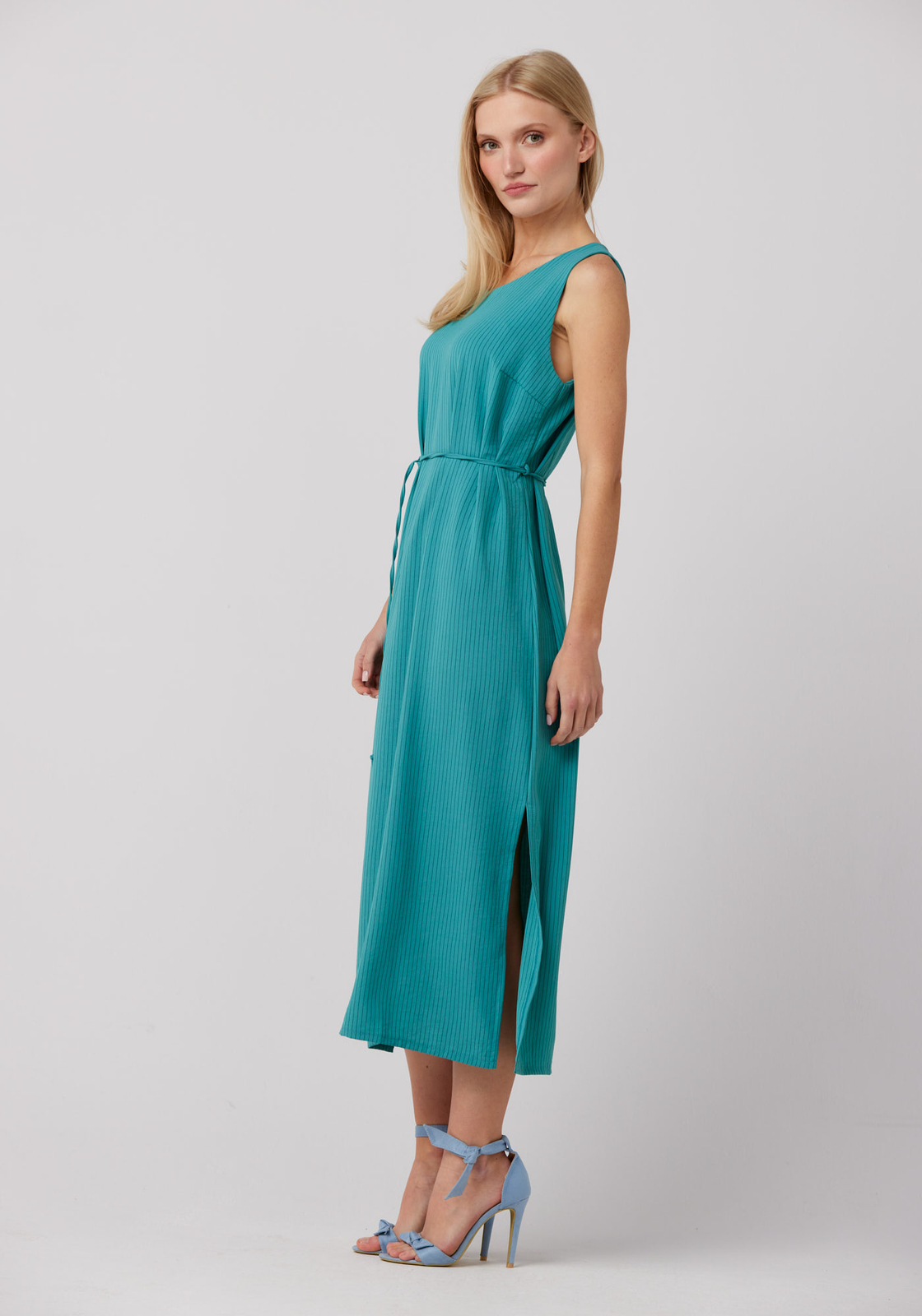 - Długa, prosta sukienka na szerokich ramiączkach z paskiem w talii. Sukienka w turkusowym kolorze. Materiał pokryty jest delikatnymi czarnymi prążkami.