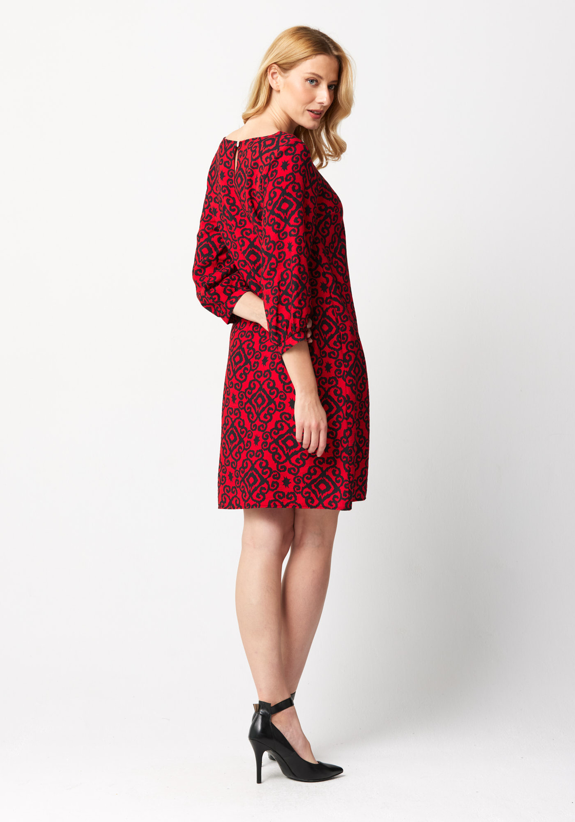 - Prosta, czerwona sukienka w czarny, geometryczny wzór. Wiskozowa sukienka z wiskozy z 3/4 rękawem. Idealna na co dzień, jak i w wersji z eleganckimi dodatkami.
