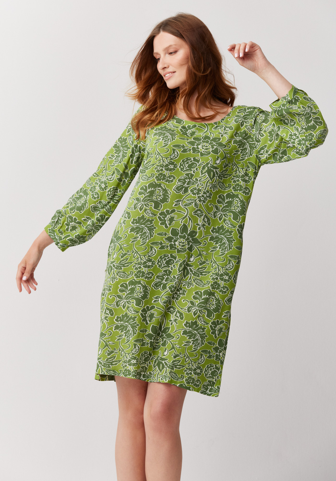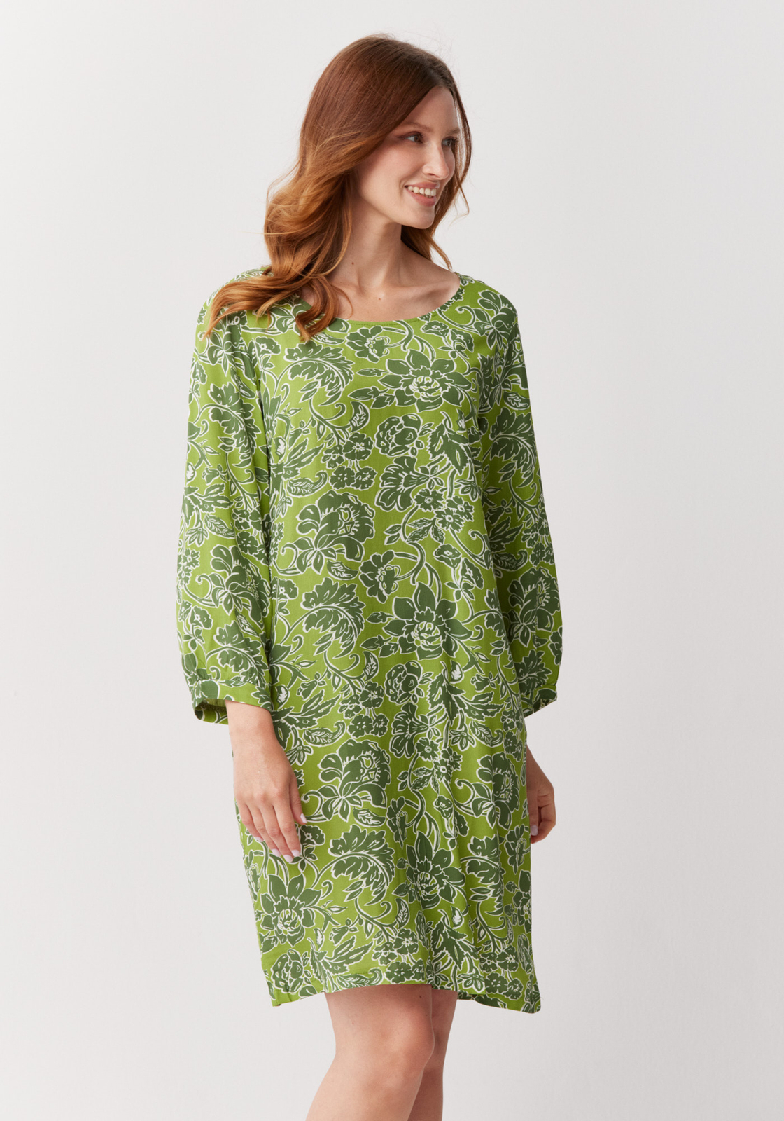 - Prosta sukienka z wiskozy. Zielona sukienka w kwiaty. Sukienka z 3/4 rękawami.