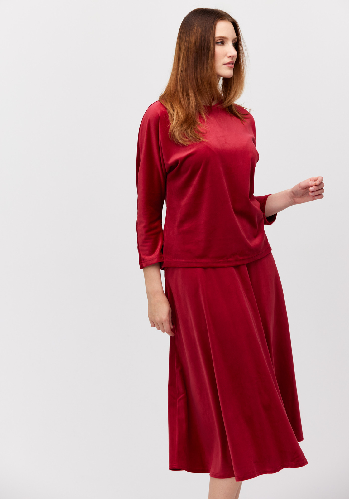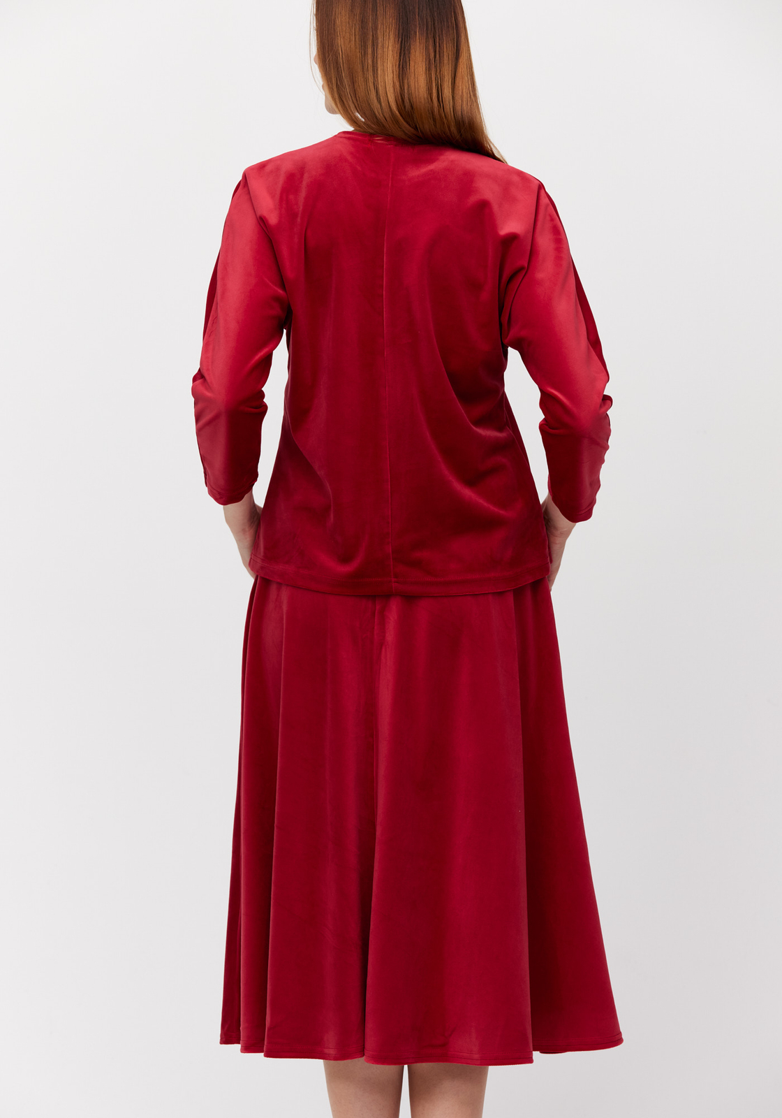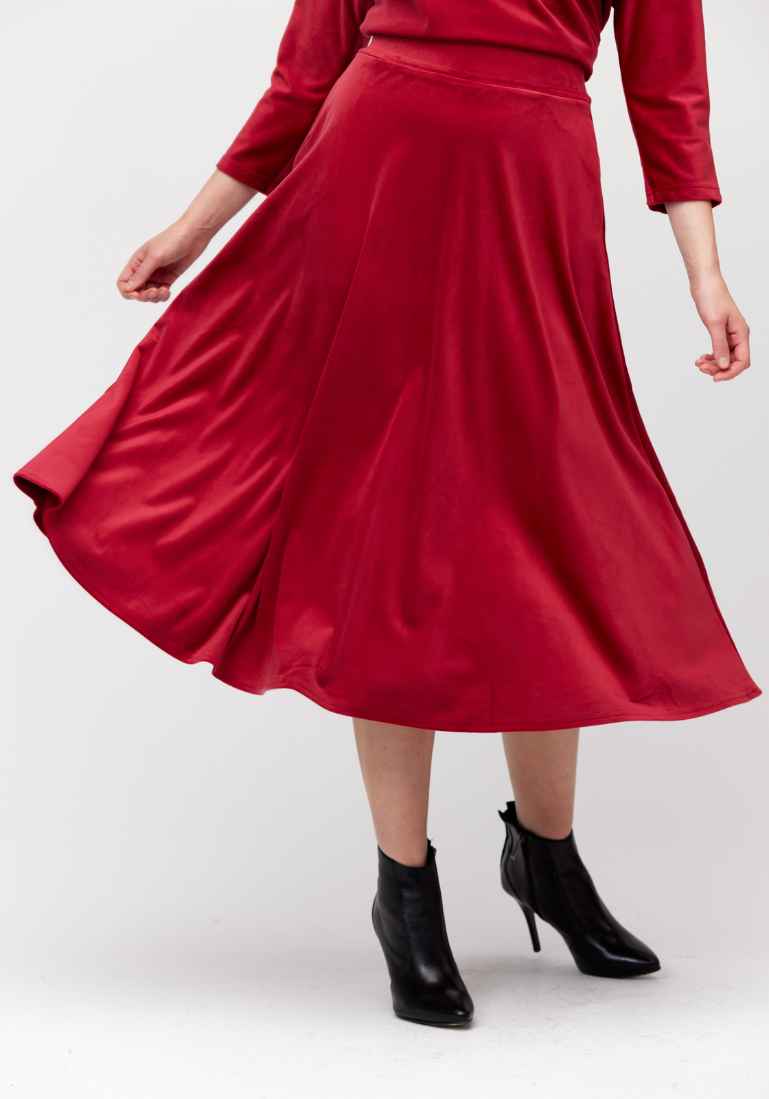 Rozkloszowana czerwona spódnica z weluru 2040