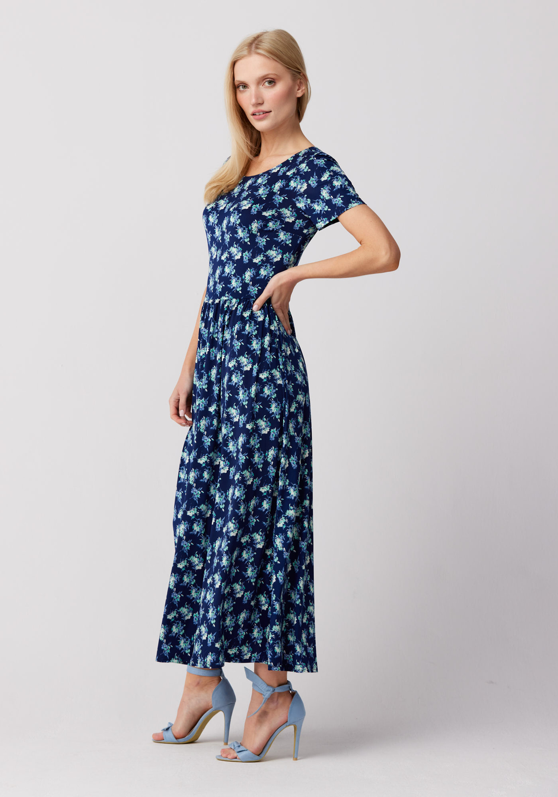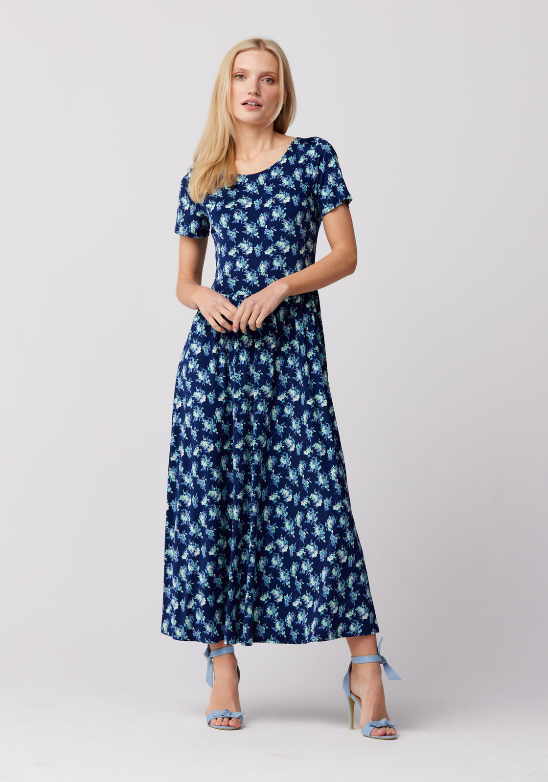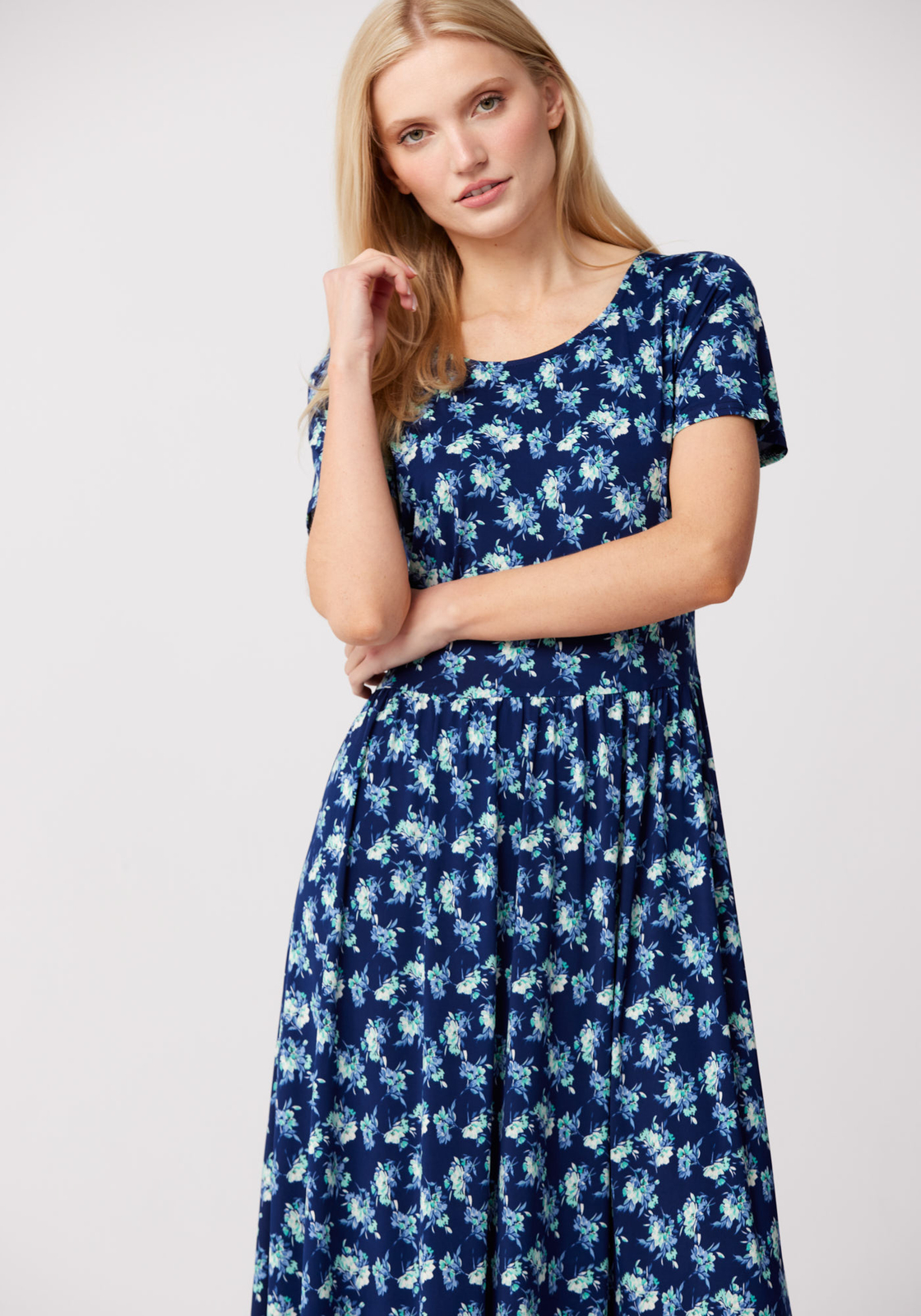 - Odcinana w talii, granatowa sukienka w miętowe kwiatki. Sukienka z krótkim rękawem o "lejącym" kroju.