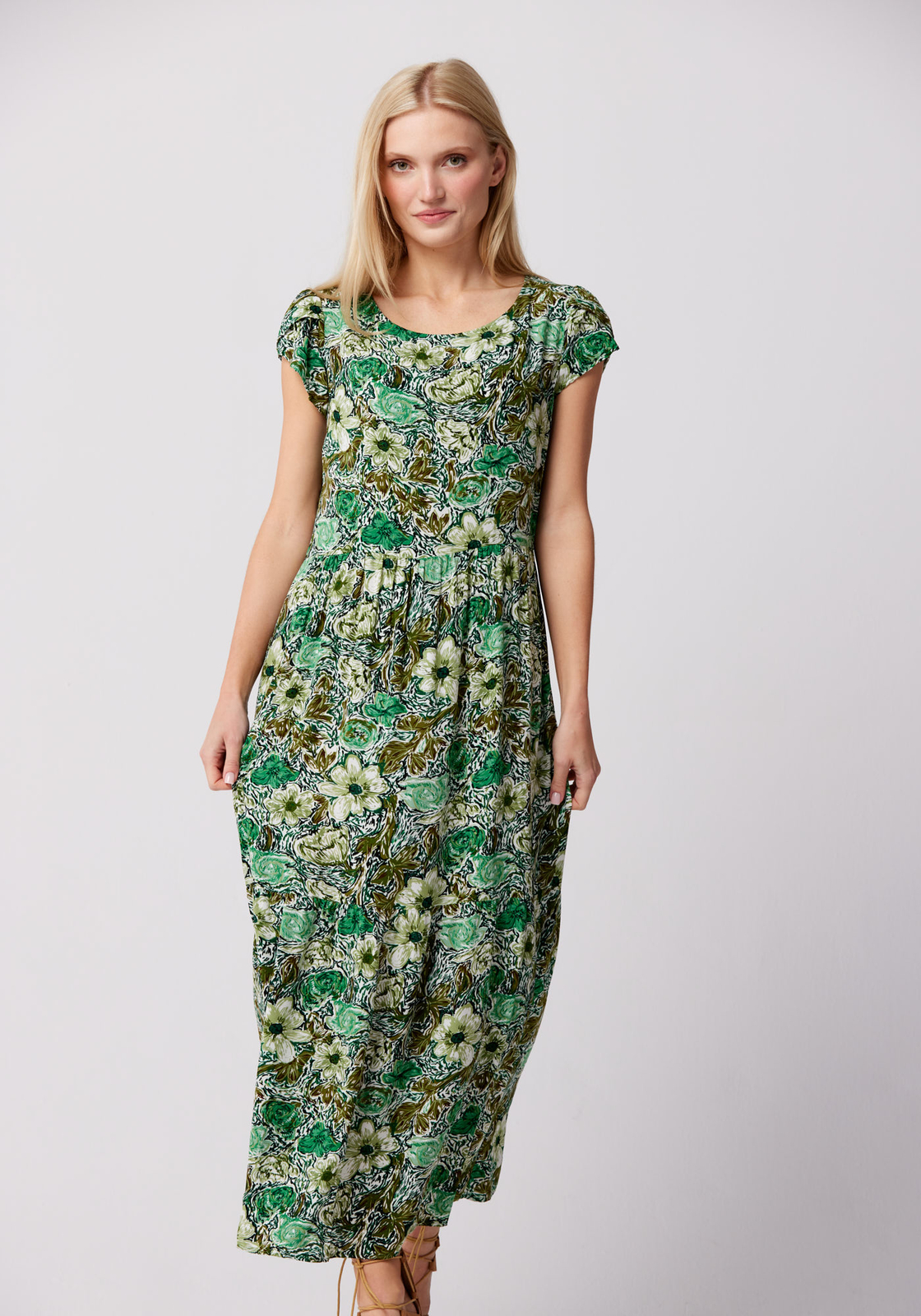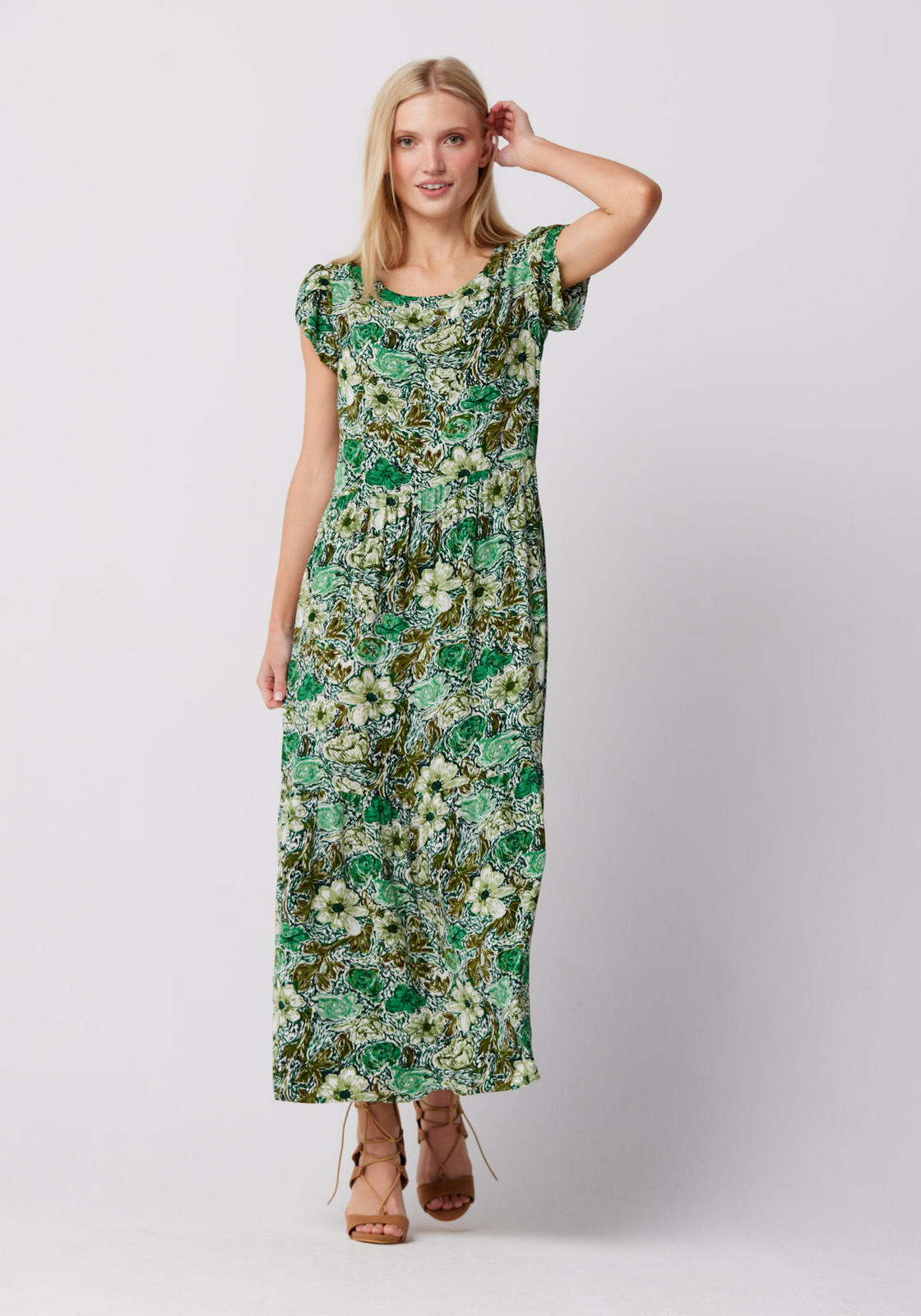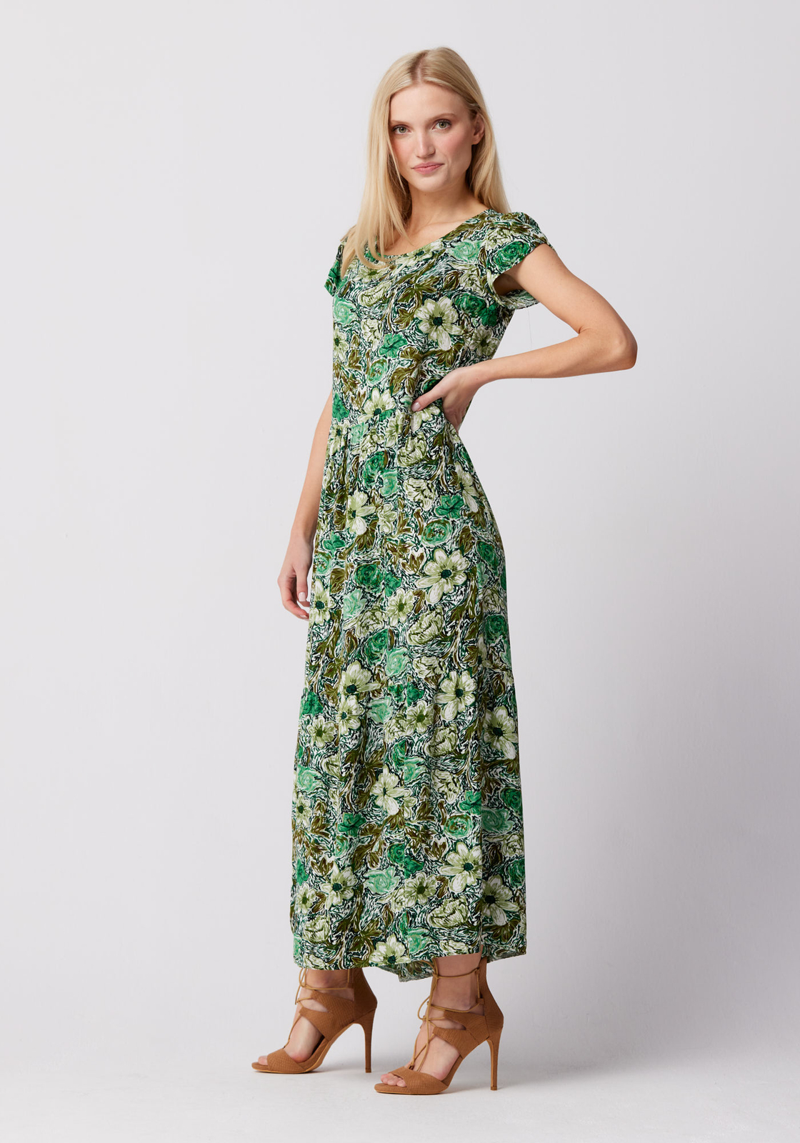 - Wiskozowa sukienka maxi w zielonym kolorze. Swobodna, letnia sukienka z tulipankowym rękawem.