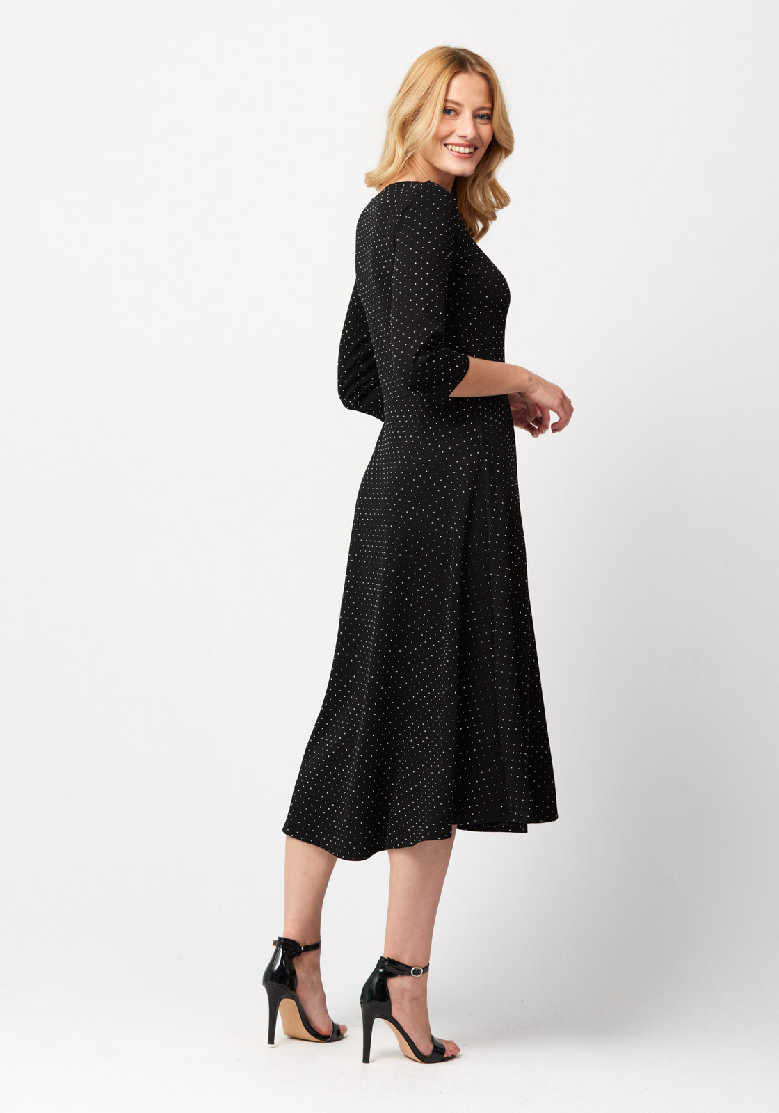 - Midi, lekko odcinana sukienka ze srebrnymi cekinkami. Swobodna sukienka z 3/4 rękawem i dekoltem w serek.