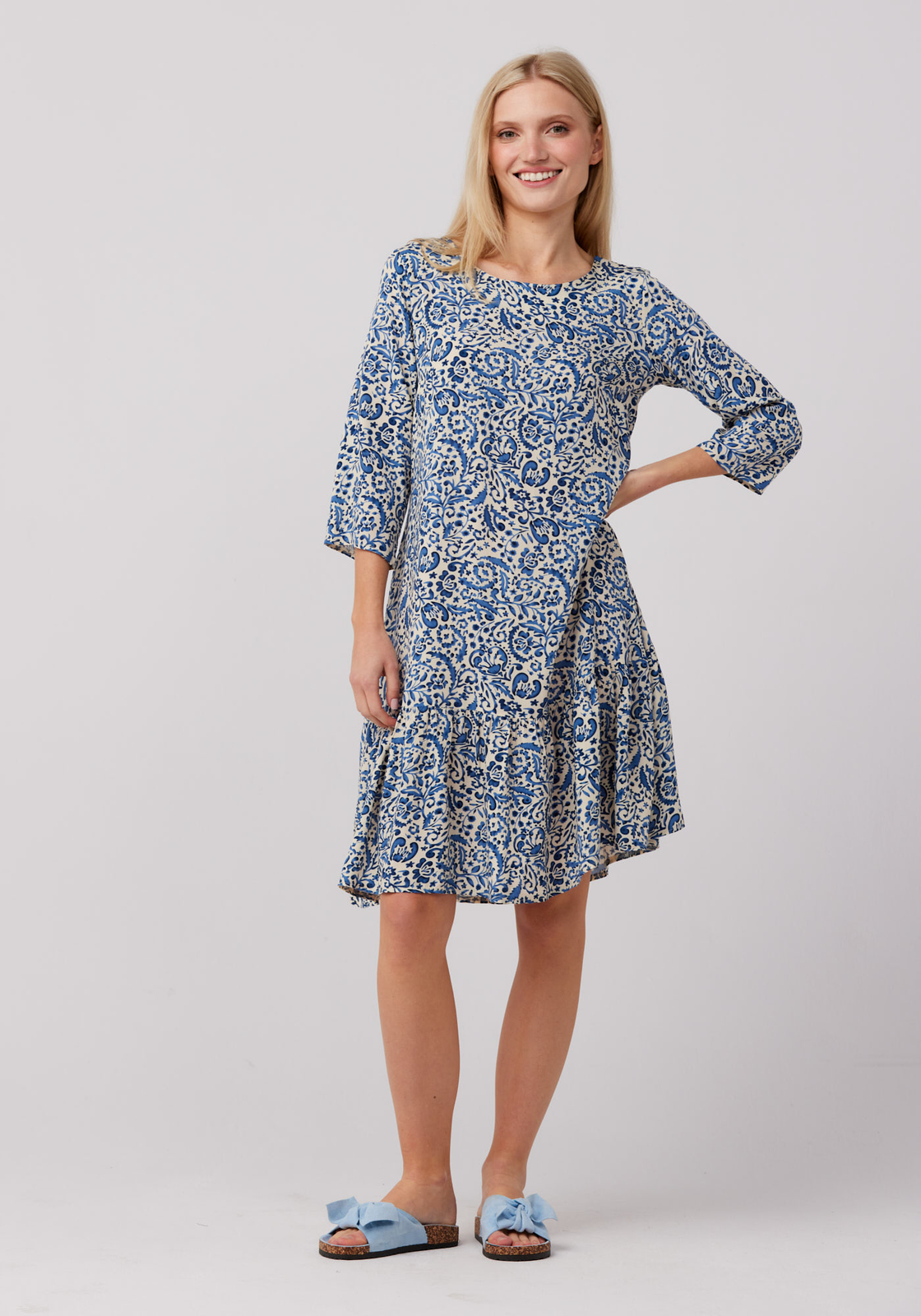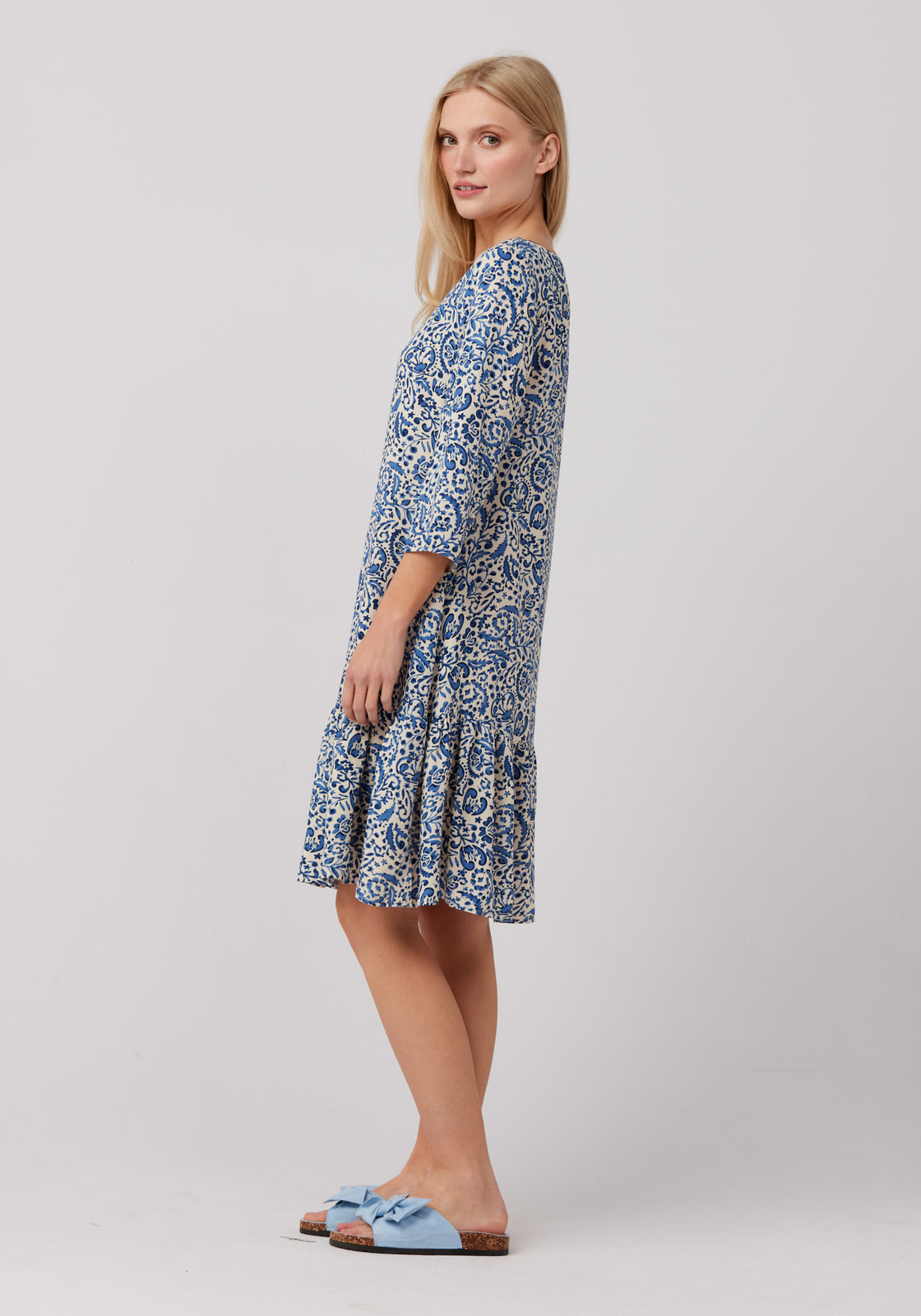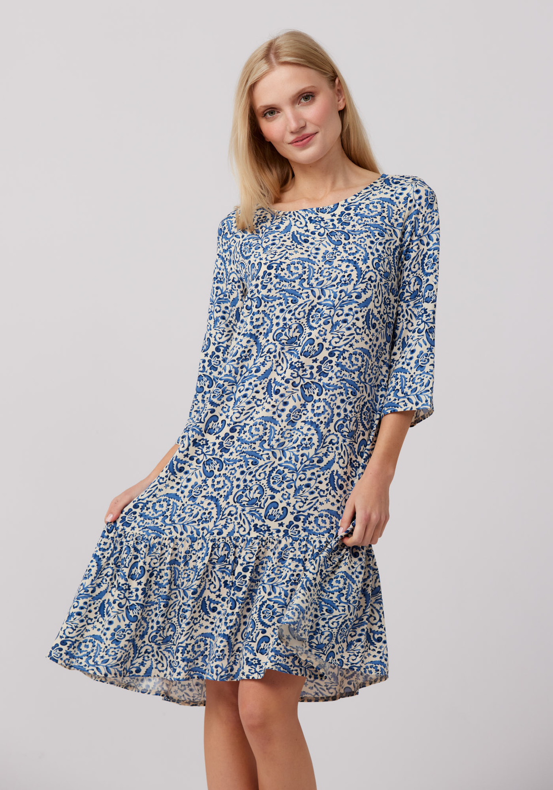 - Kremowa sukienka w florystyczny, niebieski wzór. Trapezowa sukienka z 3/4 rękawem. Sukienka zakończona falbanką dodającą lekkości.