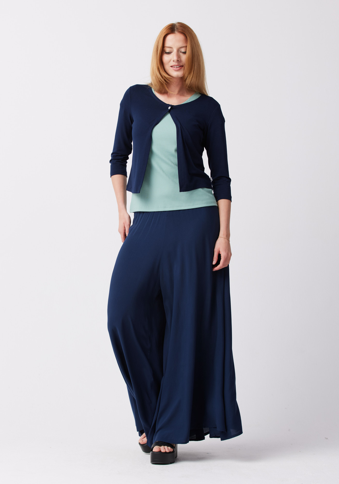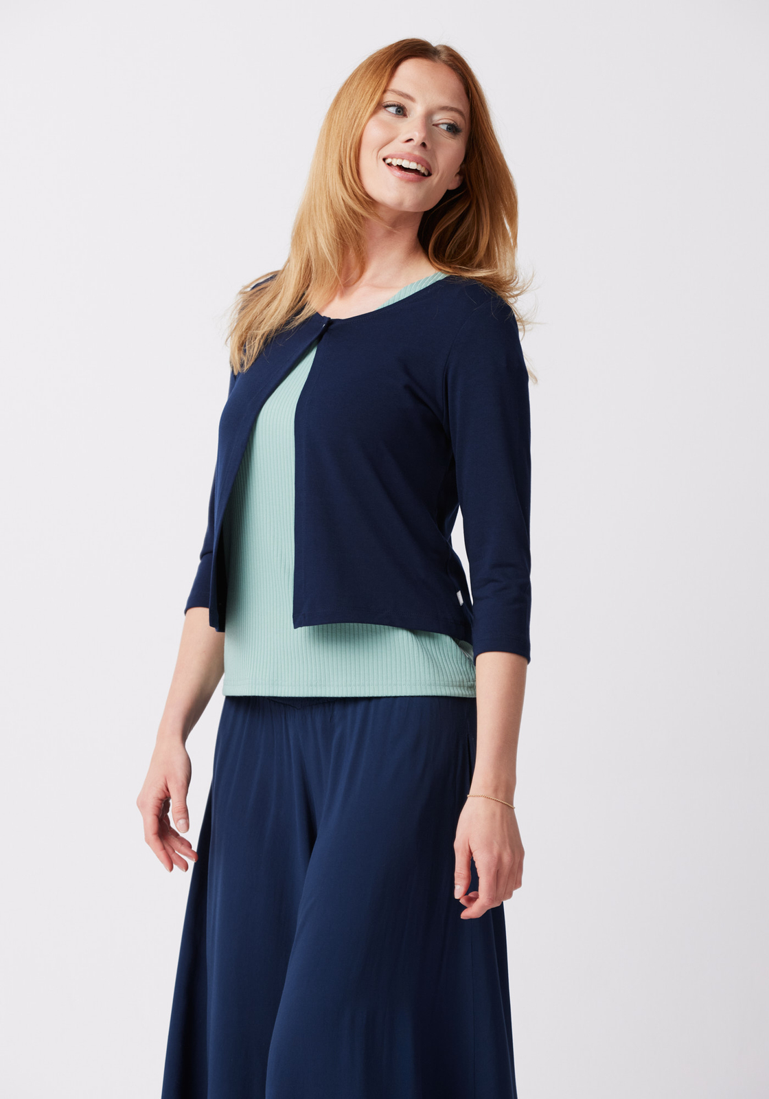- Swobodny, granatowy sweterek zapinany na jeden guzik. Cienki sweterek z 3/4 rękawem. Idealna propozycja jako dodatek do sukienek.