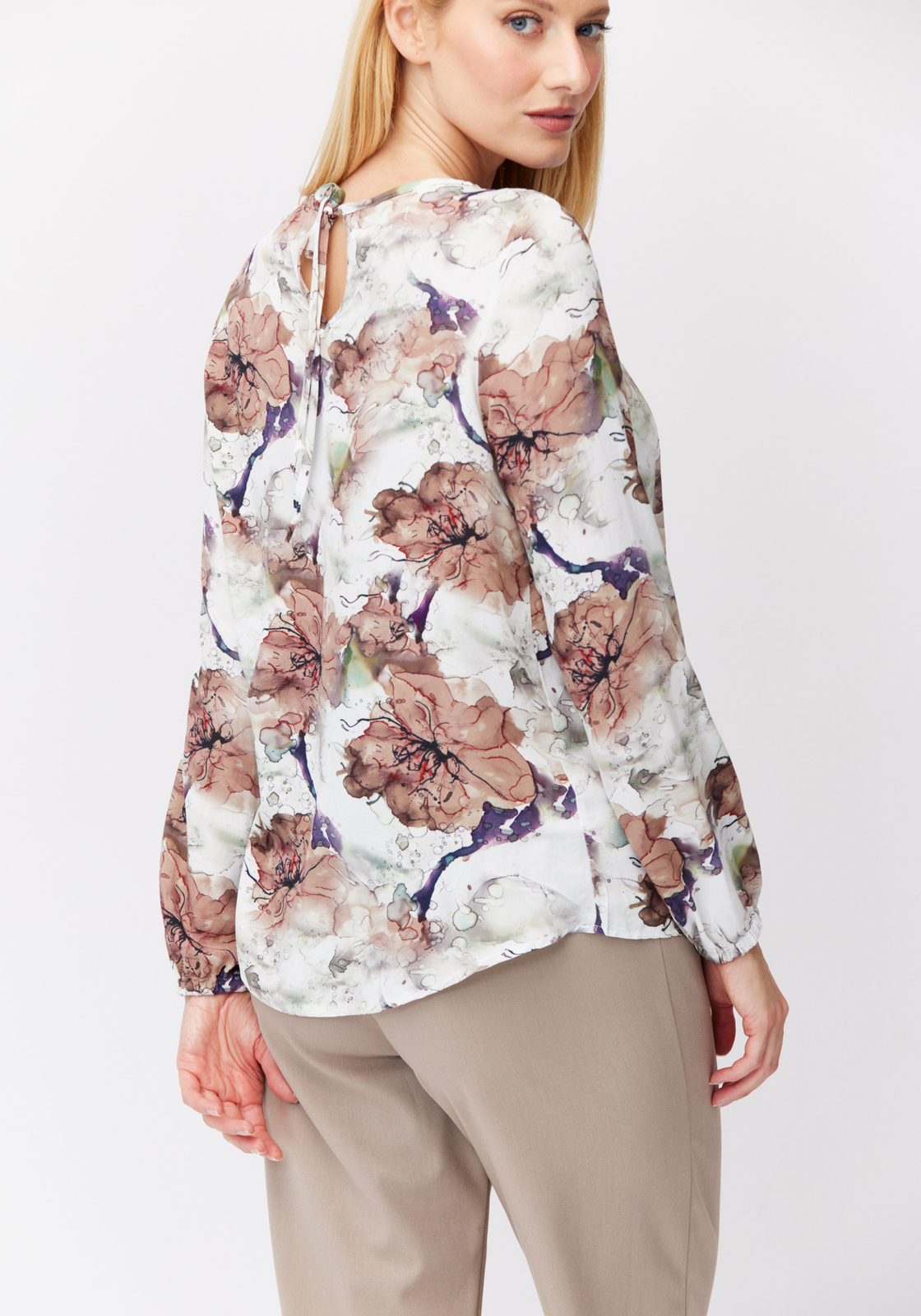 - Swobodna, luźna bluzka z wiskozy. Jasna bluzka w brązowe kwiaty. Model z długimi rękawami zakończonymi elastyczną gumką oraz wiązaniem na plecach.