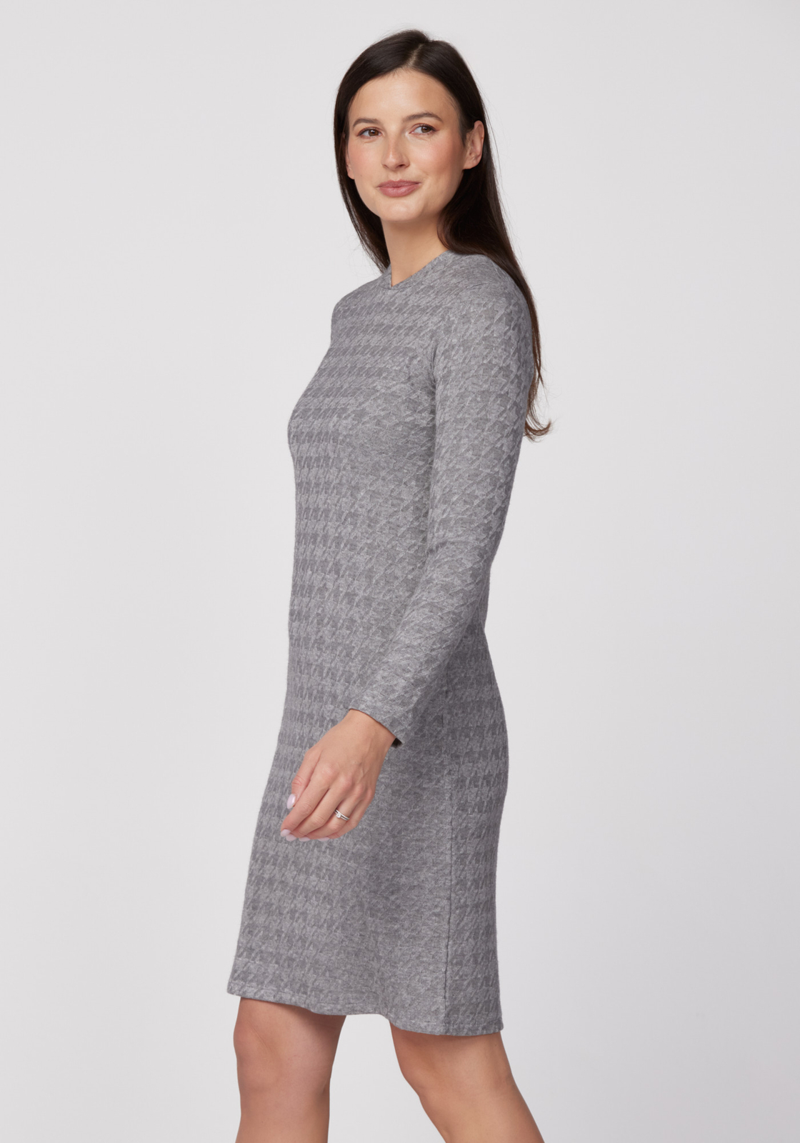 • Ciepła sukienka o prostym kroju z delikatnie podkreśloną talią. Sukienka ma niewielka stójkę przy dekolcie, jest z ciepłej, mięsistej dzianiny w odcieniach popielatej szarości w delikatną pepitkę.