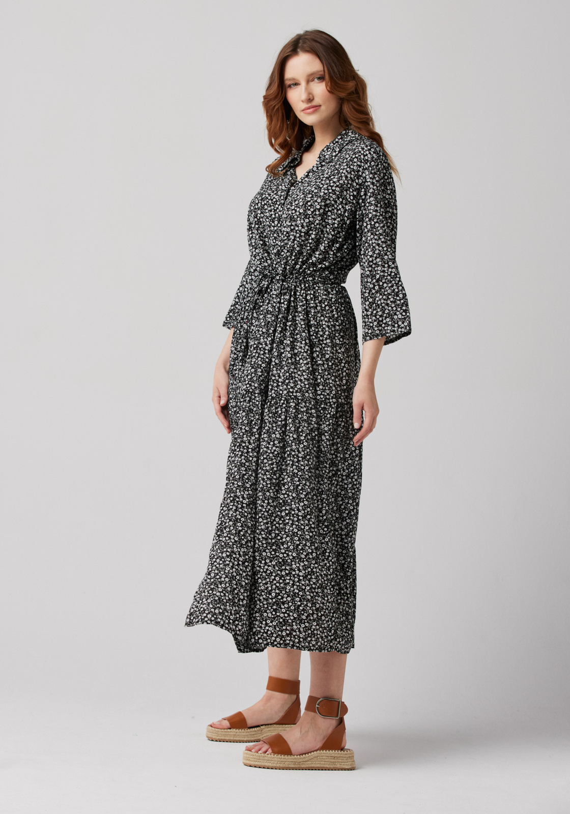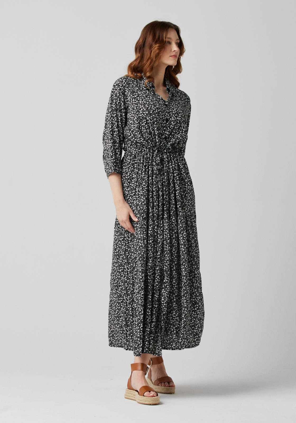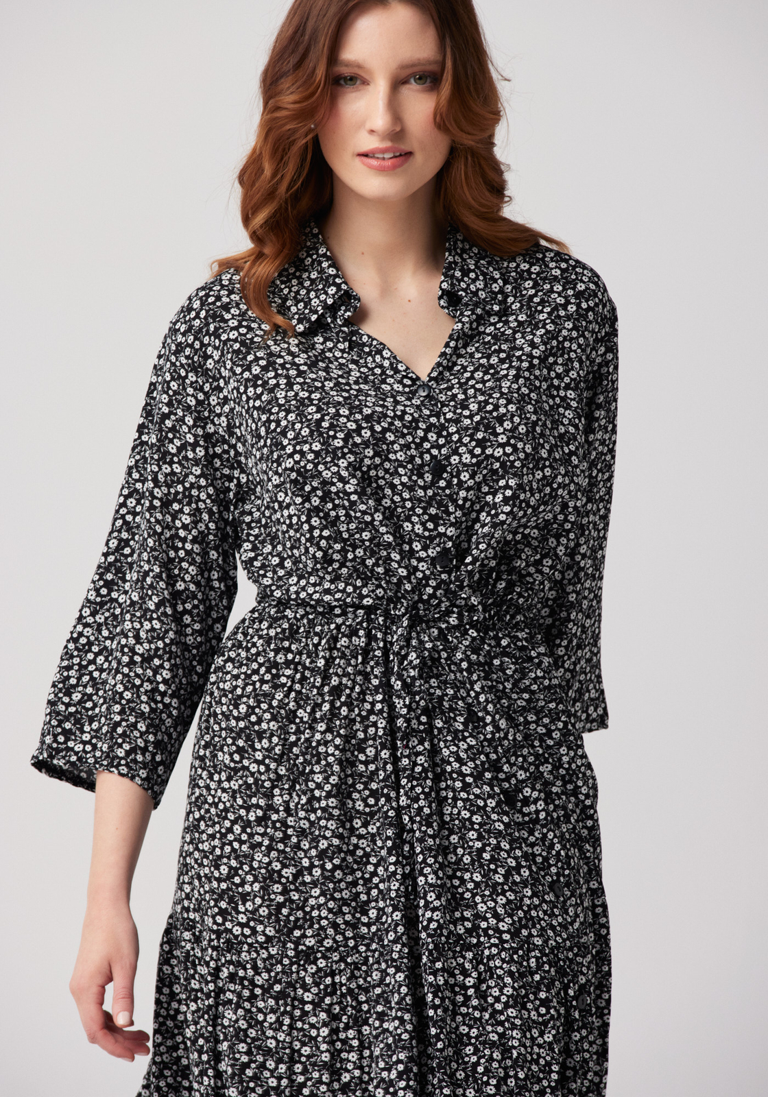 - Długa sukienka z kołnierzykiem, zapinana na guziki i wiązana w talii cienkim paskiem. Rękawy 3/4, cienki, przewiewny materiał.
