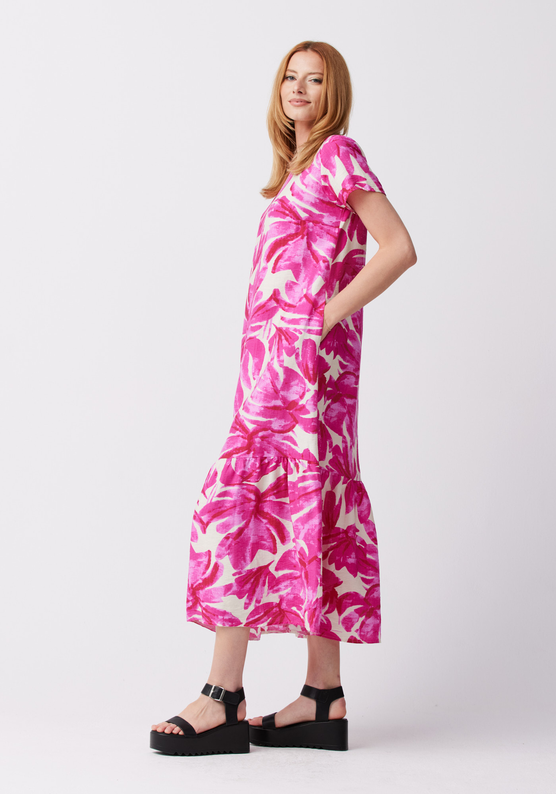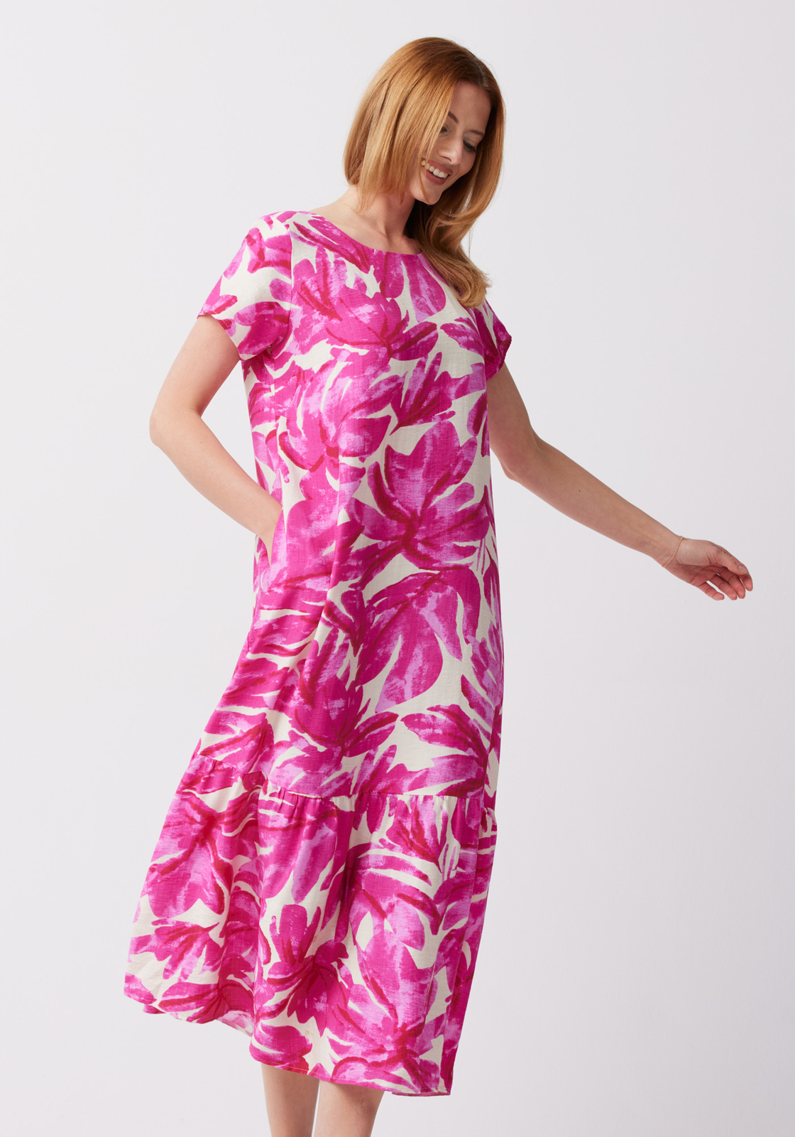 • Jasna, trapezowa sukienka z falbaną i kieszeniami. Model w piękny, kwiatowy wzór w kolorze różu.