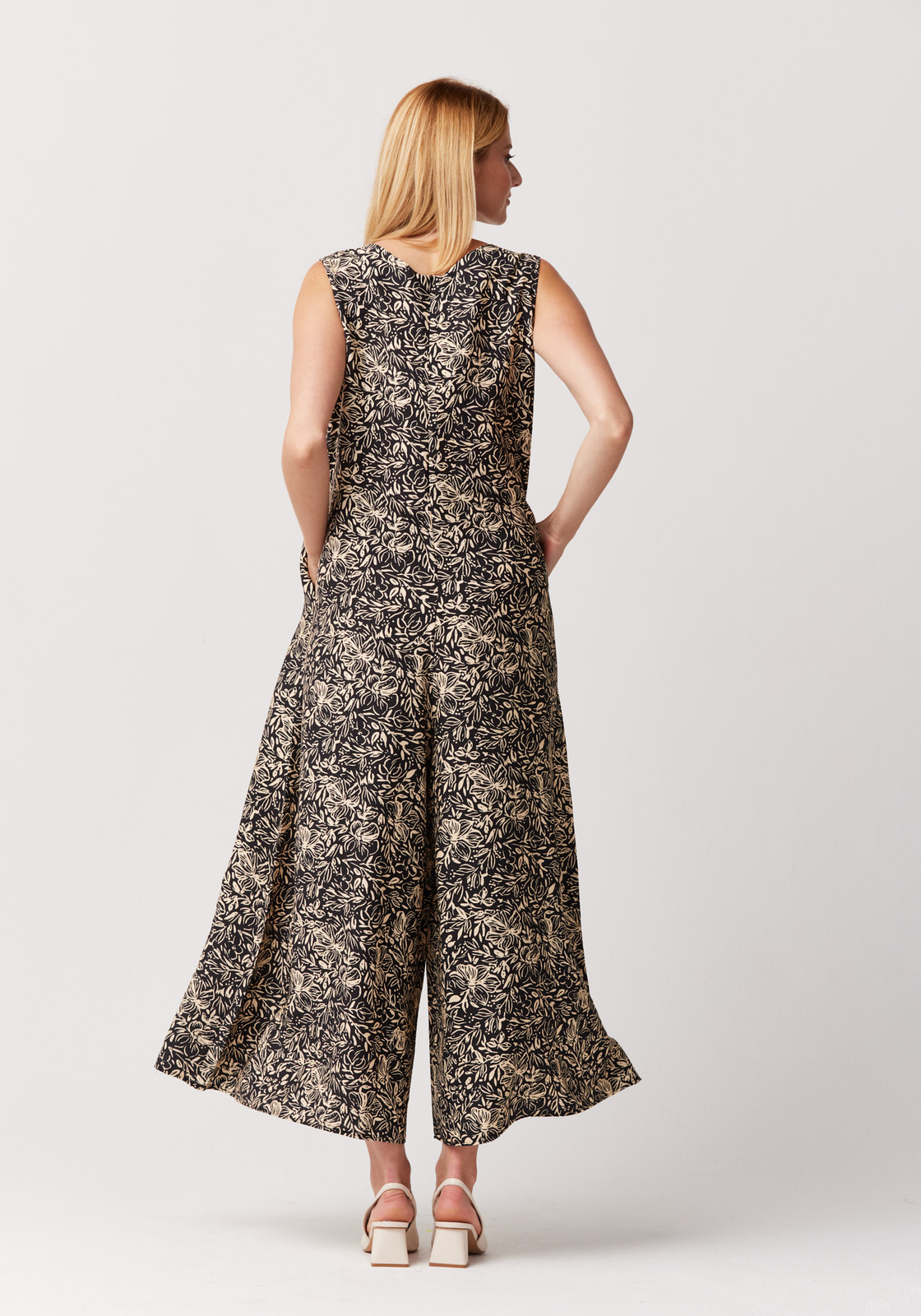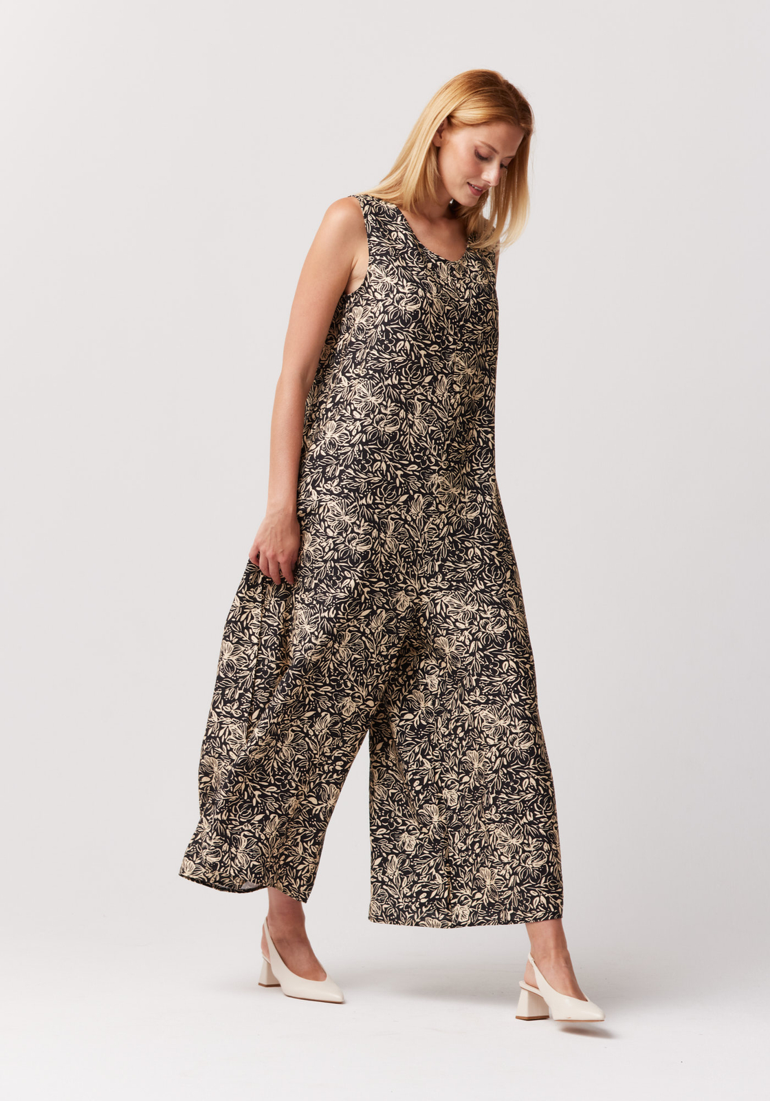 - Luźny, swobodny kombinezon w czarnym kolorze. Kombinezon w drobny, beżowy, kwiecisty wzorek. Luźna propozycja na ciepłe dni.