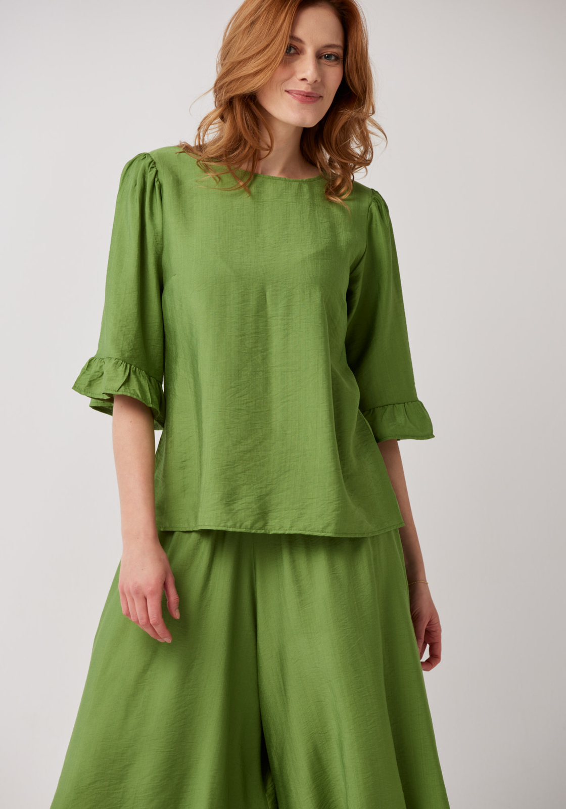 - Prosta bluzka z rękawami 3/4 wykończonymi delikatną falbanką. Bluzka jest w soczystym odcieniu zieleni. Dostępne są szerokie spodnie do kompletu.