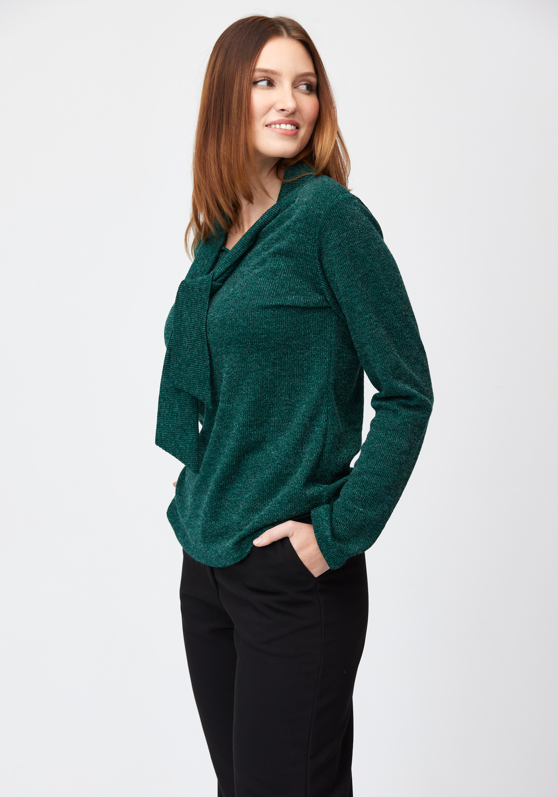 - Sweter w ciemnym odcieniu zieleni z wiązaniem przy dekolcie.